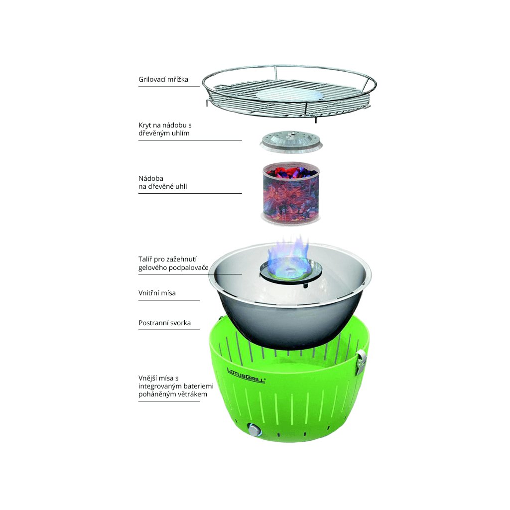 LotusGrill XL je brezdimni žar na oglje, ki ga lahko uporabljate na vrtu, terasi ali balkonu. Žar ima brezstopenjski nadzor temperature, majhno porabo oglja (180 g oglja zadostuje za približno 45-60 minut delovanja), zelo preprosto uporabo in zelo hitro pripravo. Zaradi tihega ventilatorja, ki skrbi za enakomerno segrevanje oglja, se žar segreje v 2-3 minutah. Med peko na žaru maščoba kaplja v posebno posodo. S to rešitvijo LotusGrill omogoča bolj zdravo peko na žaru brez vonja, dima in škodljivih snovi. 40,5 cm velika površina za peko na žaru je dovolj velika za 10 oseb.