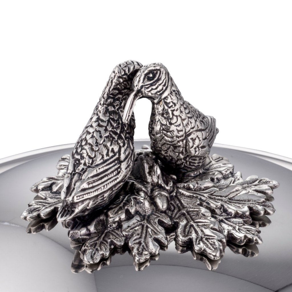 - masiven pokrov iz nerjavnega jekla z ročajem v čudovitem dekorju, ki je ročno ulit iz masivnega brona in posrebren