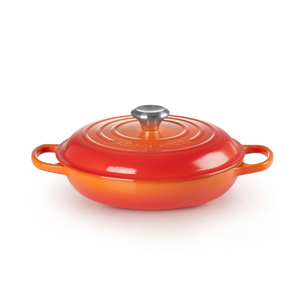 - Ploščata litoželezna ponev casserole kozica Le Creuset v barvi FLAME je izdelana v Franciji in je eden od legendarnih kosov te blagovne znamke, idealen za dušenje, cvrtje, peko in pečenje za 2-4 osebe.