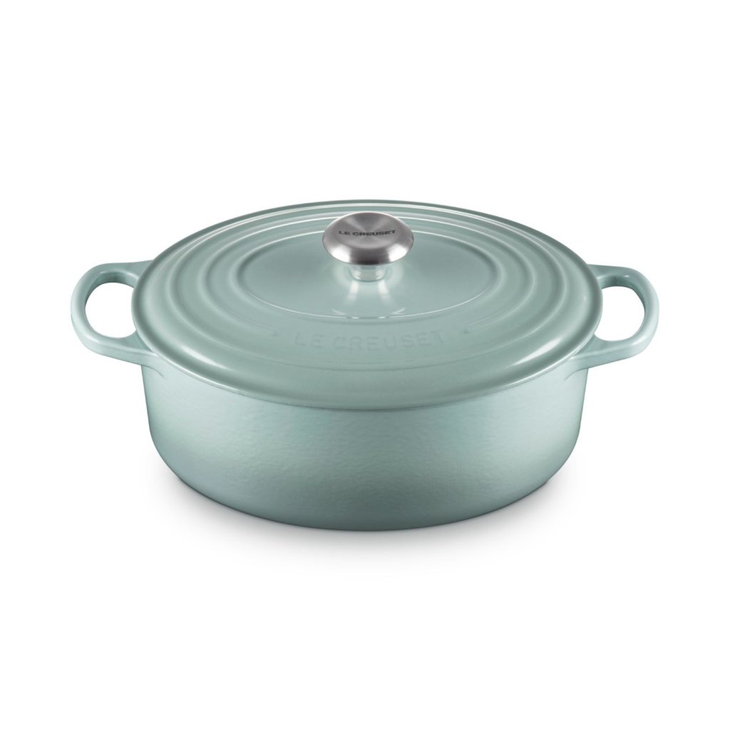 - Ovalna litoželezna pečica casserole kozica Le Creuset v barvi SEA SALT je univerzalni kuhinjski pomočnik, ki je dovolj prostoren za peko cele jagnječje stegna in hkrati dovolj ozek, da v pečici ostane prostor za priloge.