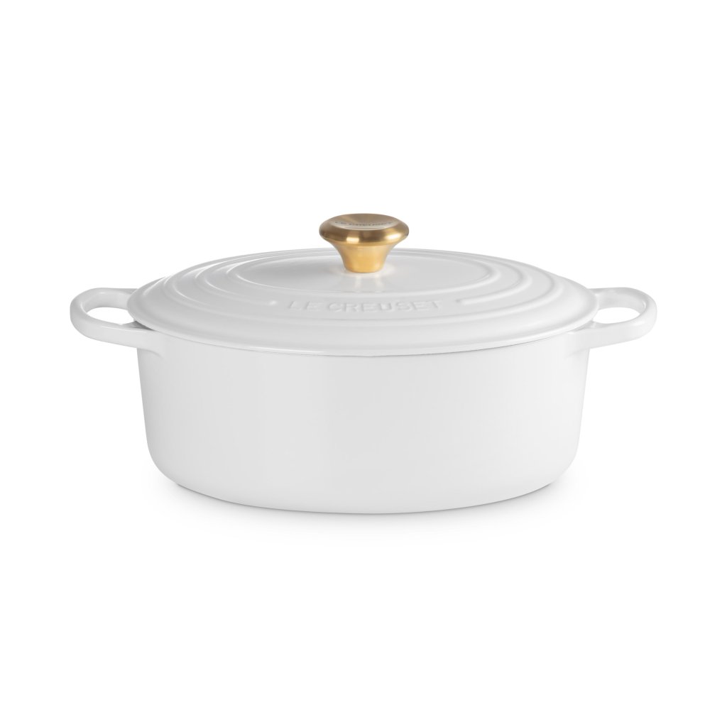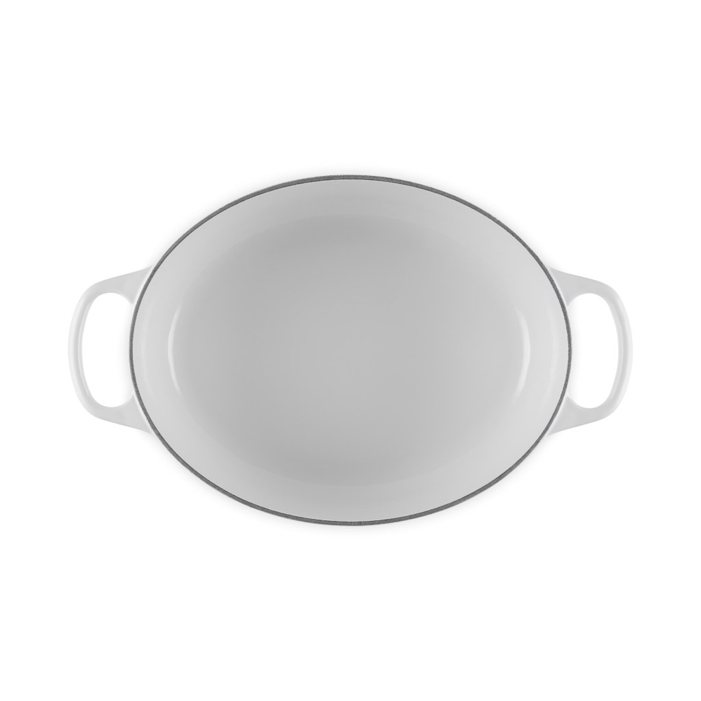 - Ovalna litoželezna pečica casserole kozica Le Creuset v barvi WHITE je univerzalni kuhinjski pomočnik, ki je dovolj prostoren za peko cele jagnječje stegna in hkrati dovolj ozek, da v pečici ostane prostor za priloge.