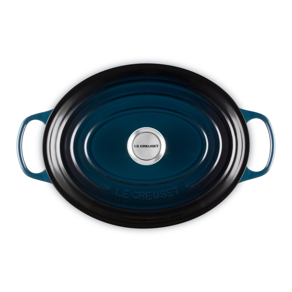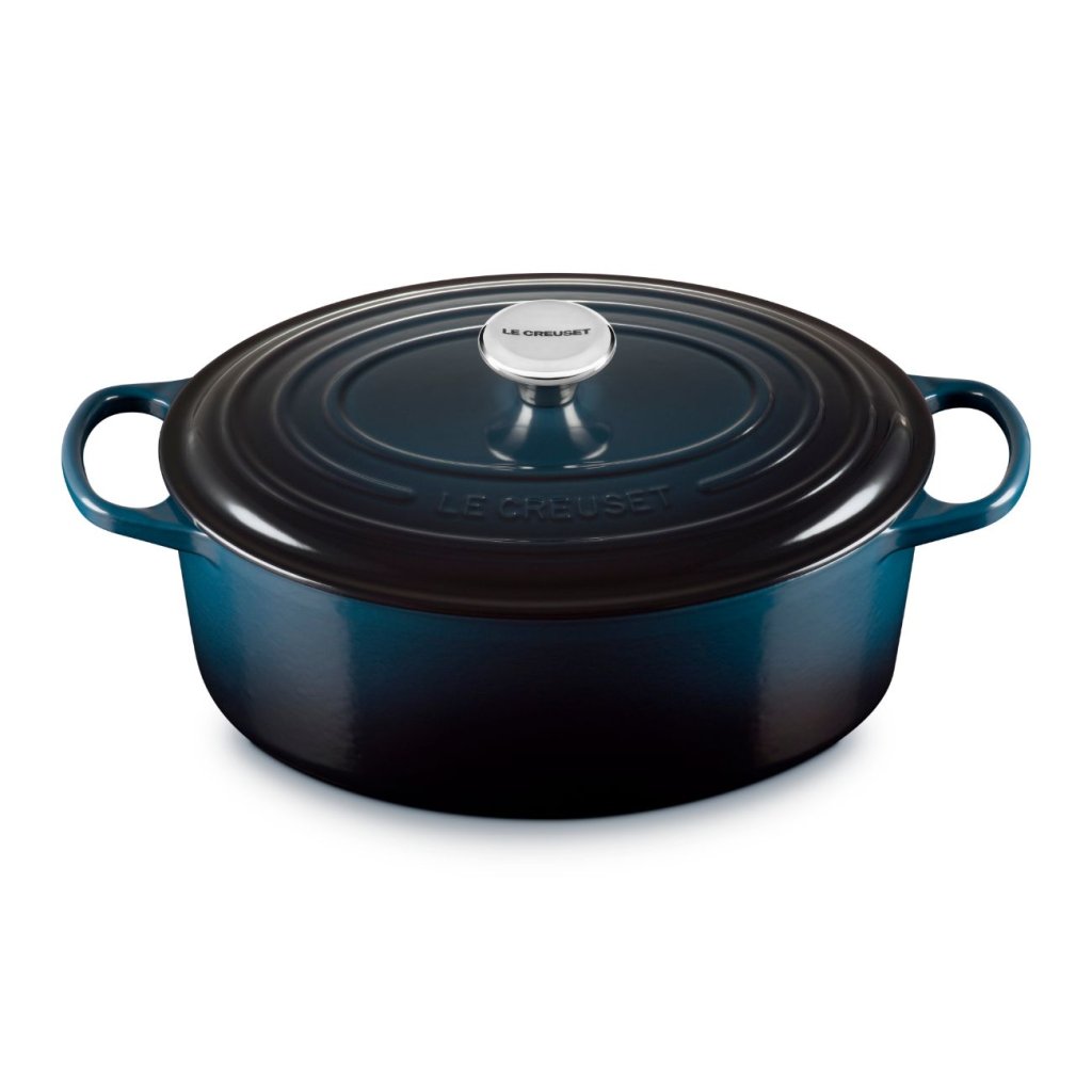- Ovalna litoželezna pečica casserole kozica Le Creuset v barvi NUIT je univerzalni kuhinjski pomočnik, ki je dovolj prostoren za peko cele jagnječje stegna in hkrati dovolj ozek, da v pečici ostane prostor za priloge.
