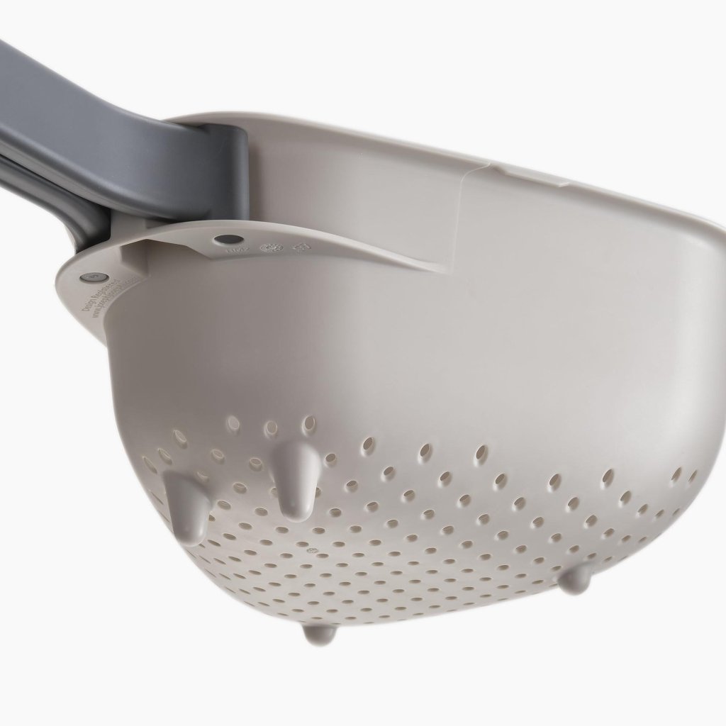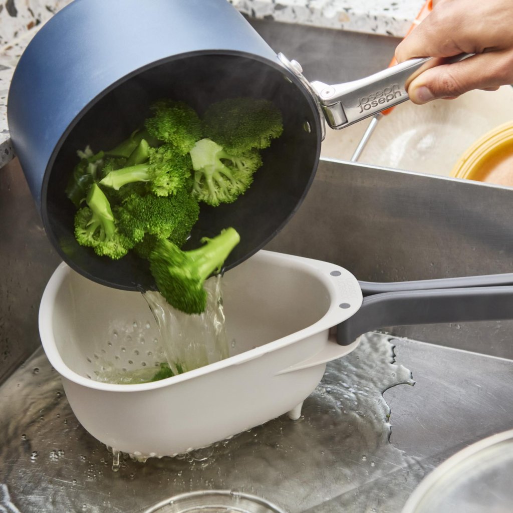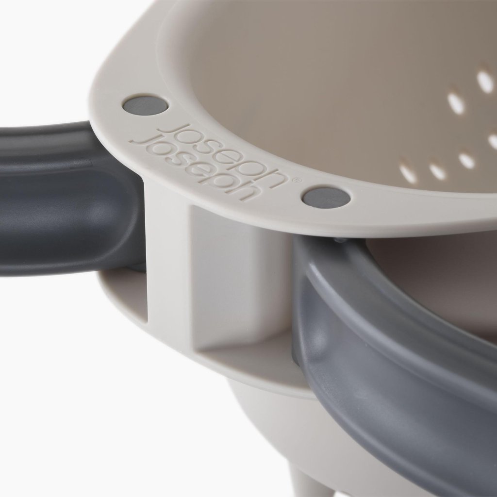 - Veliko cedilo Joseph Joseph DROPLET s praktičnim zložljivim ročajem je idealen pomočnik za priročno spiranje zelenjave, cejenje testenin in hitro odtekanje vode neposredno nad umivalnikom.