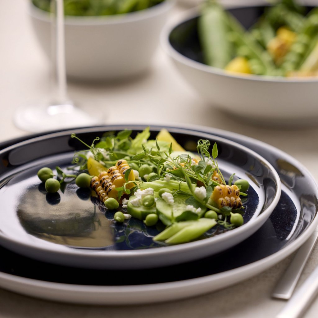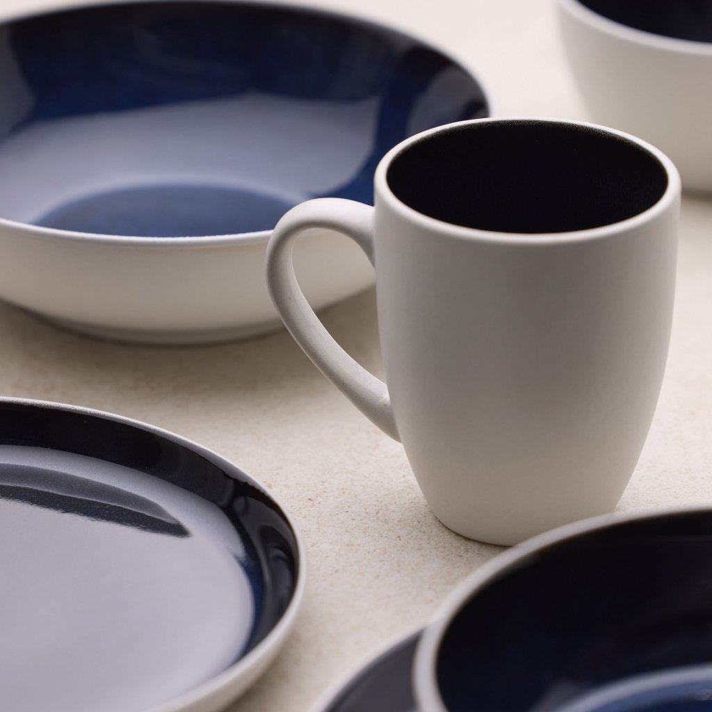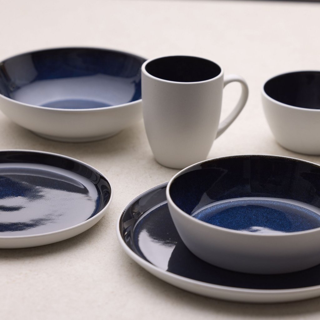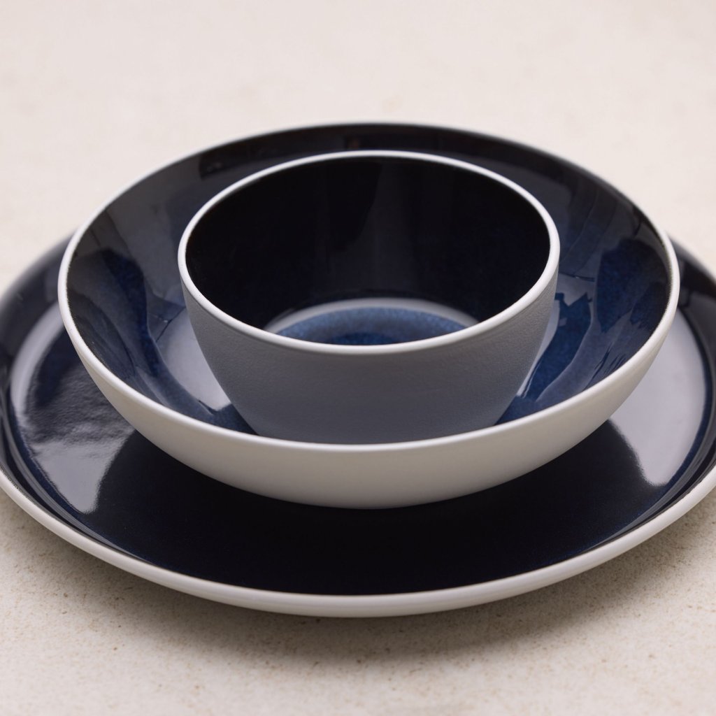 - Sijajna notranja glazura v temno modrem odtenku spominja na globino nočnega neba in vsakemu obroku doda impresiven okvir.