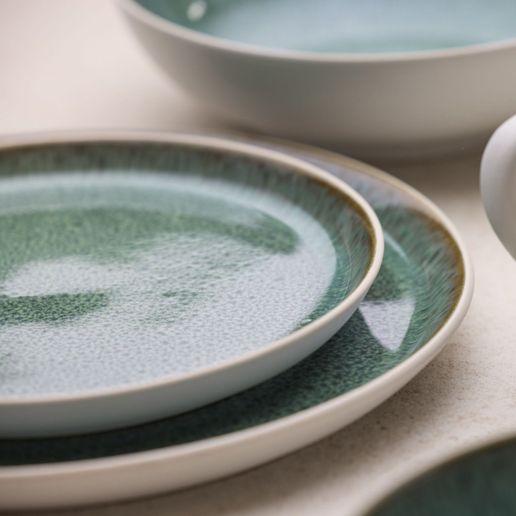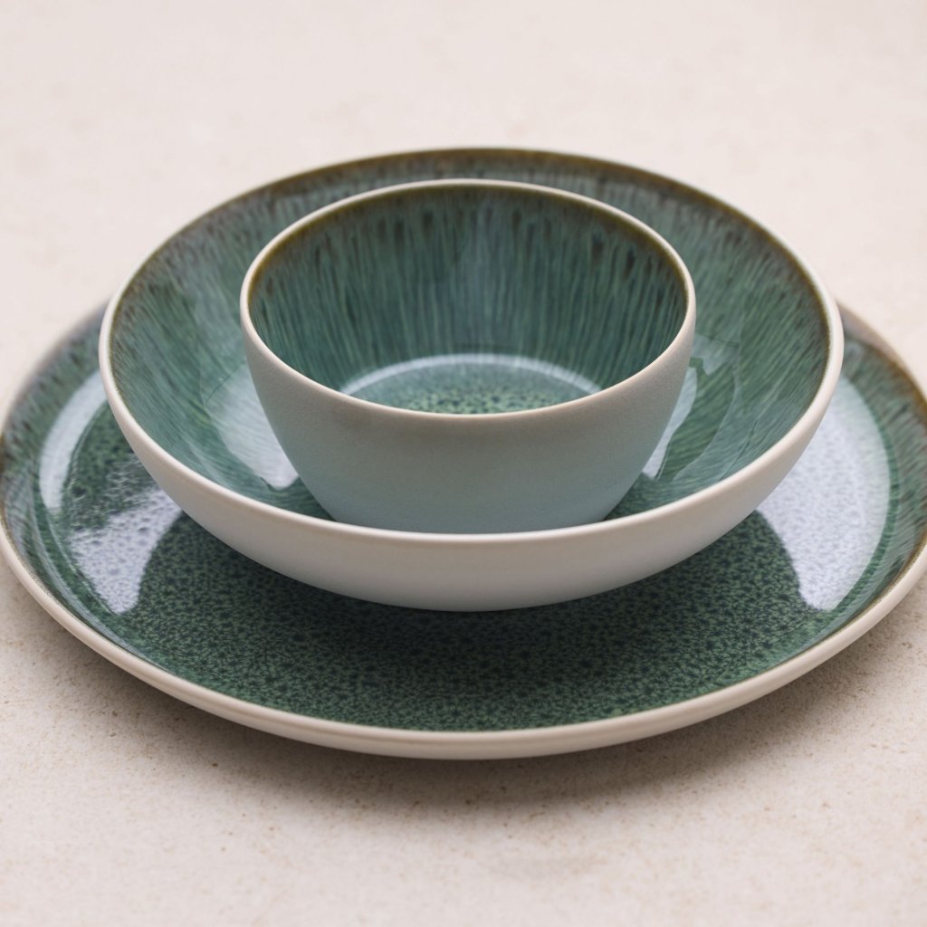- Notranji del s sijajno glazuro v zelenih odtenkih je videti živahen in naraven, kot mirna gozdna površina, in daje vsakemu obroku impresiven okvir.