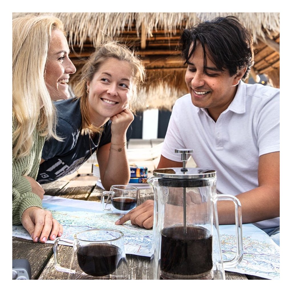 - čajnik napolnite z mleto kavo, zalijte z vrelo vodo in po nekaj minutah počasi pritisnite bat, da bo rezultat popoln