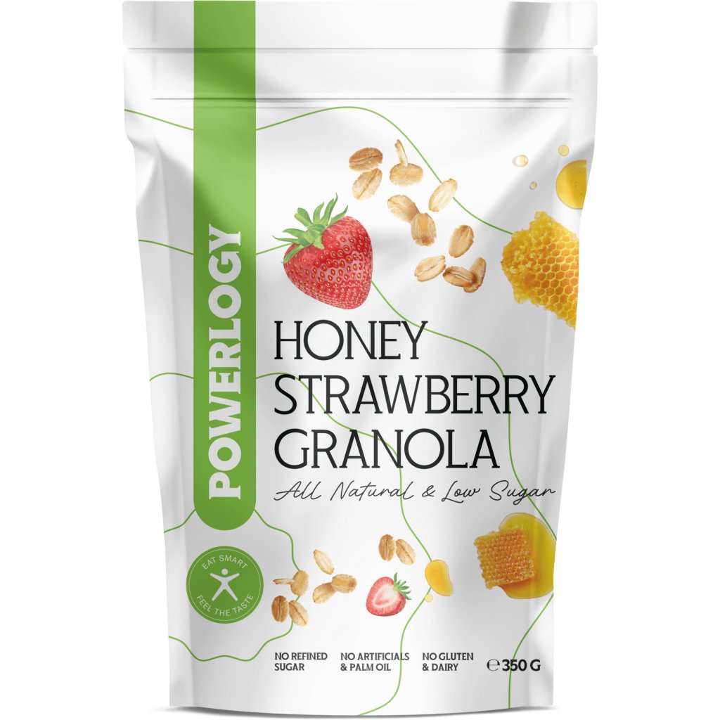 - granola za zajtrk brez glutena z medom, hrustljavimi mandlji in jagodami