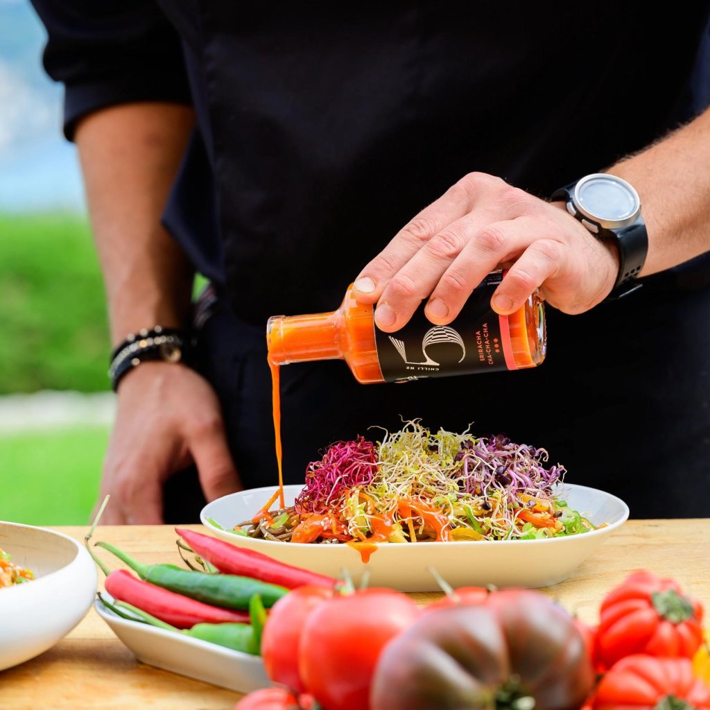 - SRIRACHA CHA CHA CHA iz Chilli No5 je zdrava, veganska in izjemno okusna pekoča omaka v elegantni steklenici, ki bo vsak obrok dvignila na novo raven.