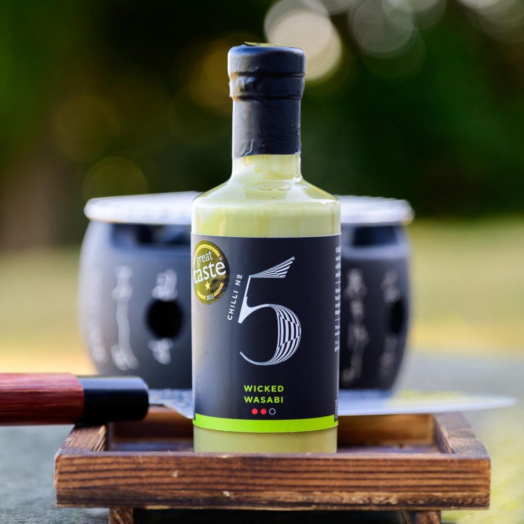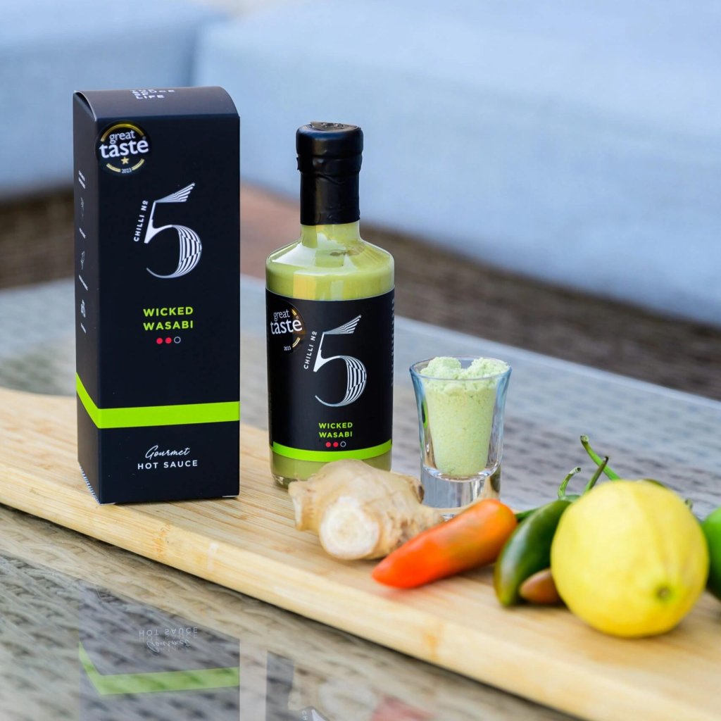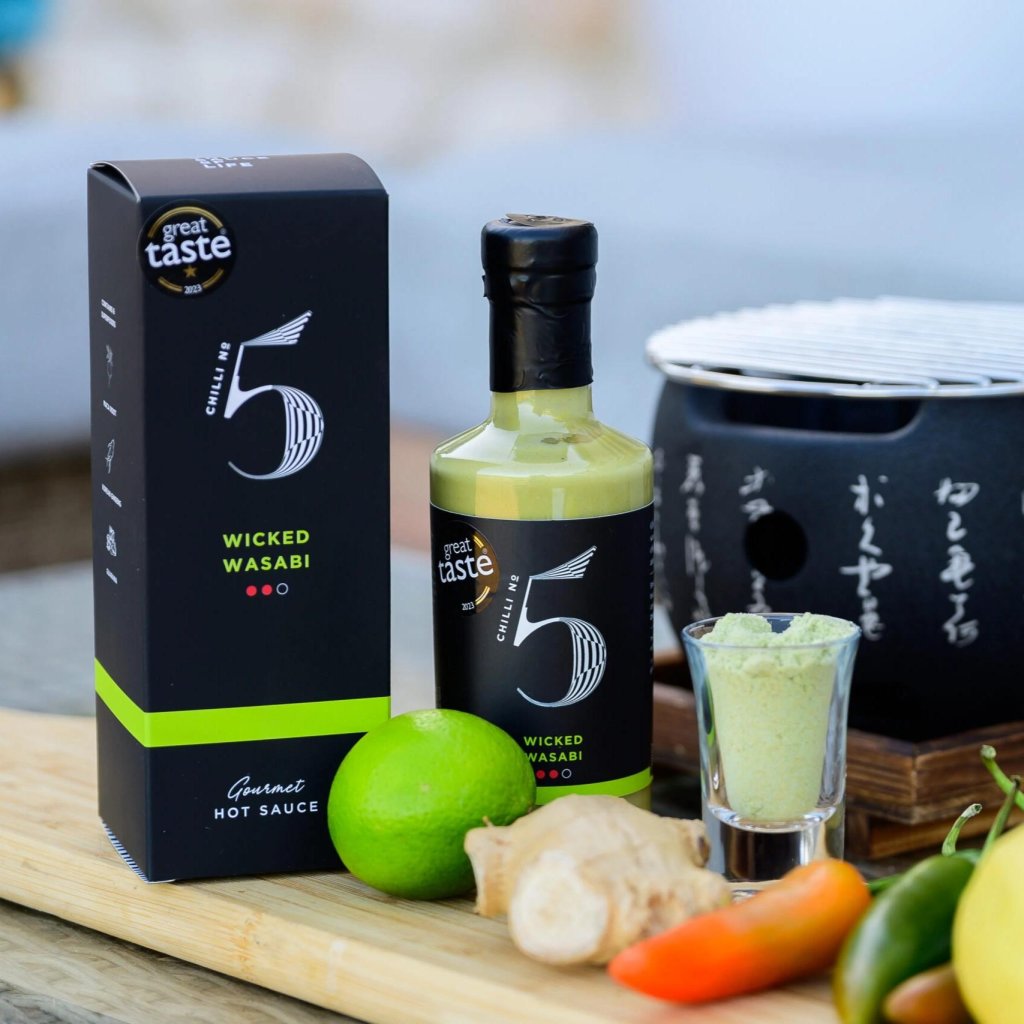 - WICKED WASABI iz Chilli No5 je pekoča omaka, idealna za suši, ki združuje subtilno ostrino vasabija z globino čilija in svežino citrusov, kar ustvarja nepozabno okusno izkušnjo.