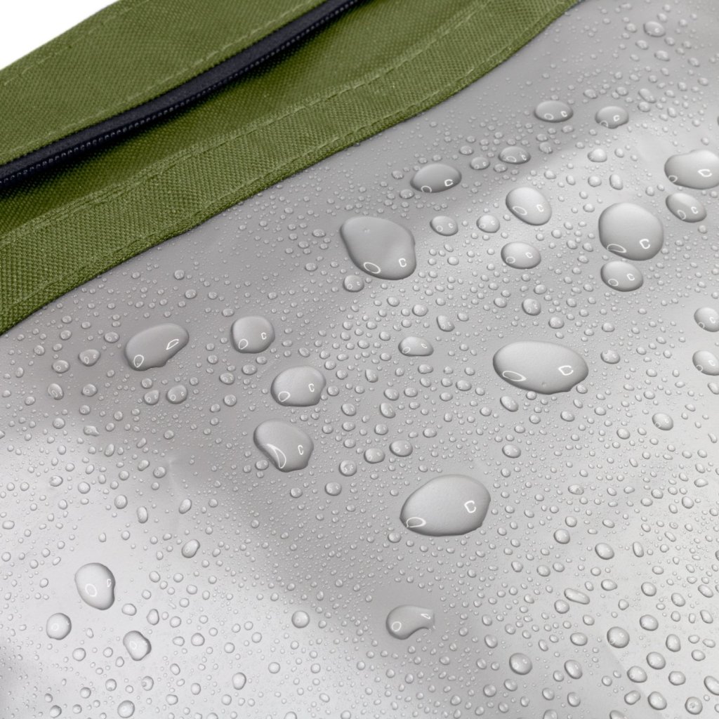 - material: jeklo (zadrga), polipropilen (pas), recikliran PET poliester (zunanja tkanina), BPA in PEVA varen za hrano (notranja podloga z varjenimi šivi)