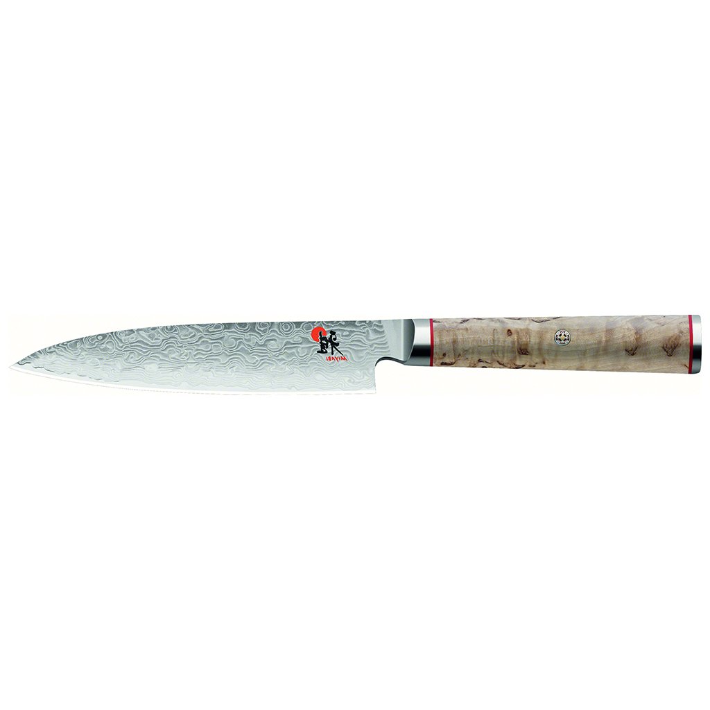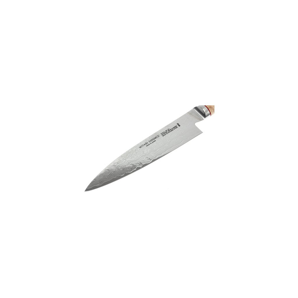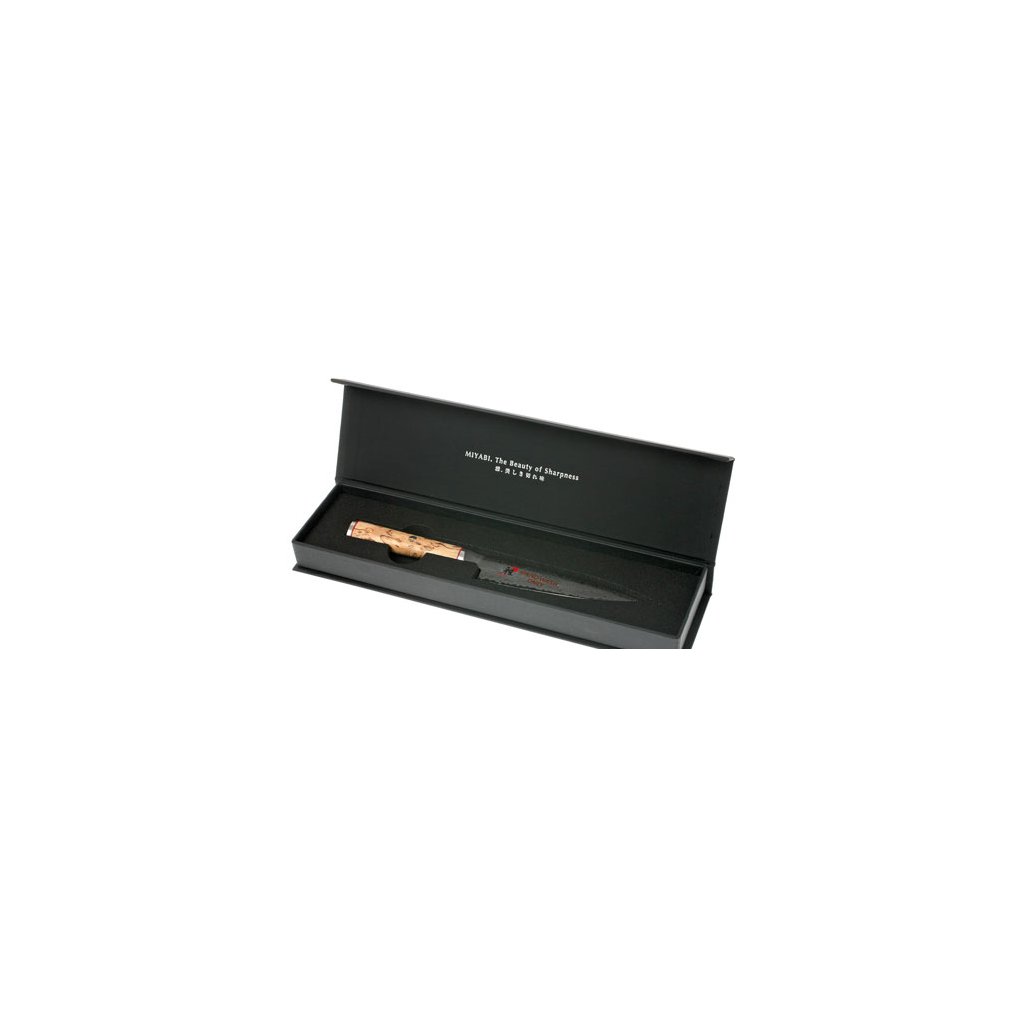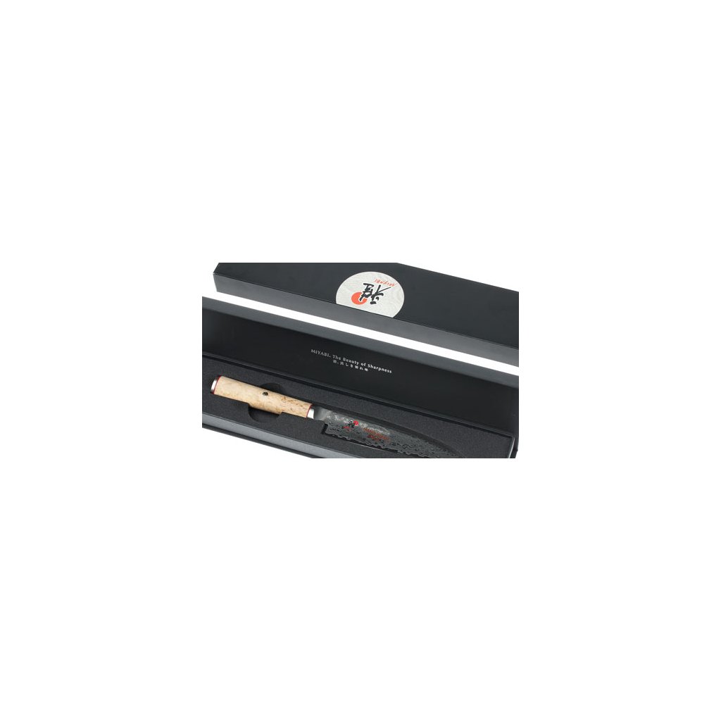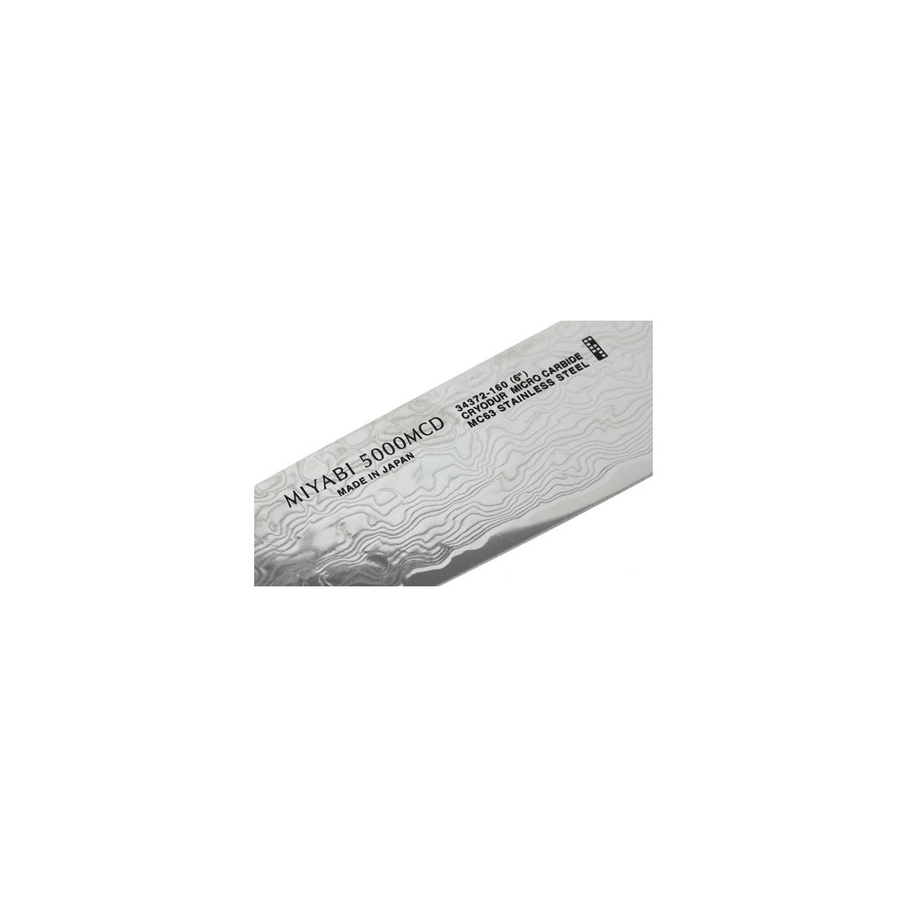Serija nožev MIYABI 5000MCD združuje popolno funkcionalnost, ergonomijo in edinstveno obliko. Vsak nož je rezultat pristne izdelave v "mestu nožev" Seki. Tradicionalna izdelava in sodobna tehnologija sta zagotovili najvišjo možno kakovost med komercialno proizvedenimi noži. Izjemno trdo jekleno jedro iz prahu Micro Carbide MC63 je obdano s 100 plastmi jekla dveh različnih trdot. Posebna obdelava rezila daje rezilu večplastno teksturo, zaradi česar ima vsak nož izviren in edinstven damascénski cvetlični vzorec. Za doseganje še boljših lastnosti jekla je bil uporabljen edinstven postopek kaljenja CRYODUR®, med katerim se jeklo zaledeni na -196 °C. Dobljeni material se ponaša z izjemno trdoto 63 Rockwella. Nož je simetrično ročno brušen v obliki črke "V" pod kotom 19°. Tradicionalno ročno brušenje nožev Honbazuke je dokazano z večstoletnim delom mojstrov izdelovalcev nožev. Gre za večstopenjski postopek brušenja, pri katerem se nož najprej naostri z vertikalno in horizontalno vrtečim se brusilnim kamnom, nato pa se rezilo polira z usnjenim brusilnim trakom. Zaradi klinasto oblikovanega rezalnega roba rezilo zlahka prodre v živila. Klasični ročaj v obliki črke "D" je izdelan iz breze Masur. Tekstura in zrnatost lesa sta na vsakem kosu edinstveni. Uporabljeni material odlično simbolizira japonsko spoštovanje narave. Prefinjen okras ročaja se skriva v podrobnostih v azijskem slogu - podstavek iz nerjavnega jekla z logotipom, okrasni zatič z mozaično teksturo in rdeča črta prinašajo močno estetsko izkušnjo.