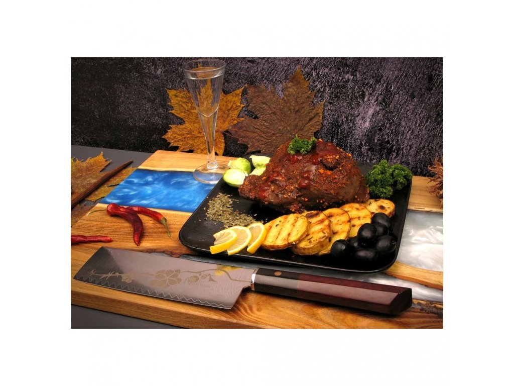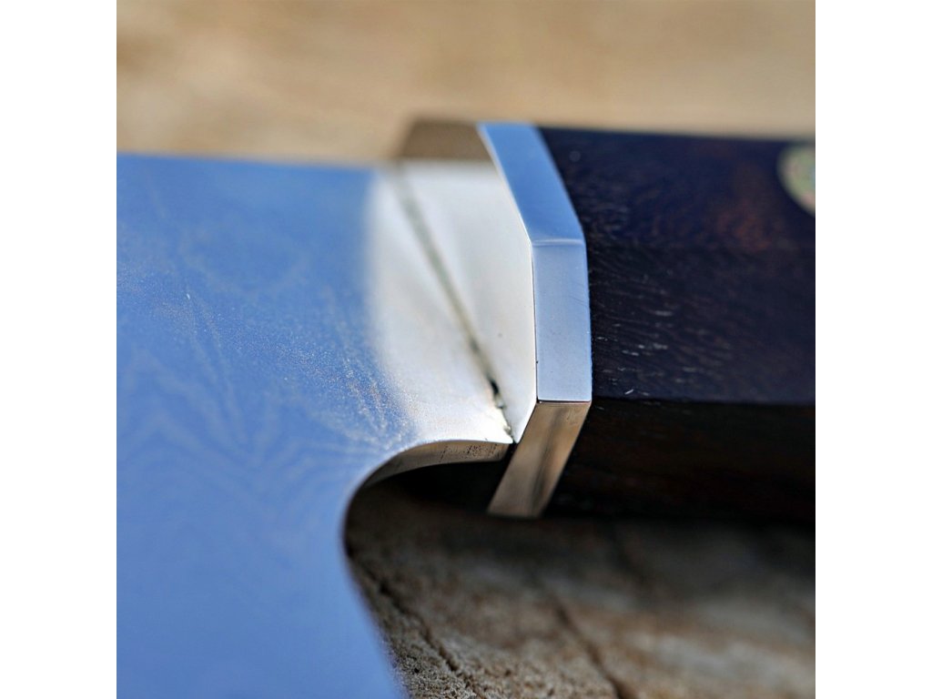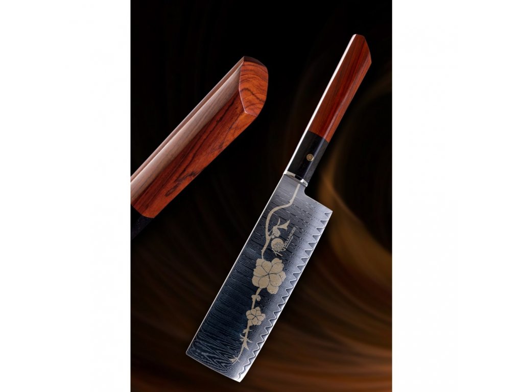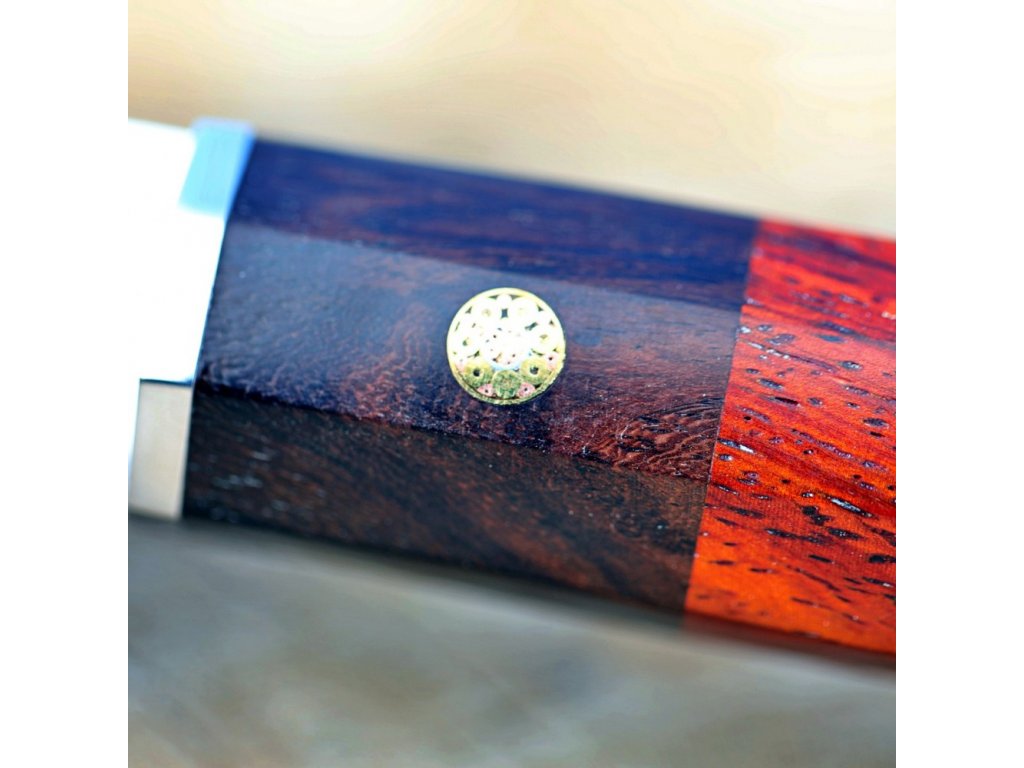 Osmerokotni ročaj je izdelan iz stabiliziranega palisandra in ebenovine. Okrašena je z osrednjo mozaično zakovico in vedno skrbno ročno polirana ter ergonomsko oblikovana. Idealno zasnovan za odličen ročni nadzor. Posebno oblikovana oblika ščitnika je primerna za azijski oprijem noža.