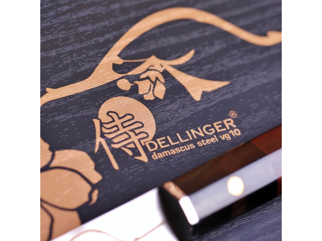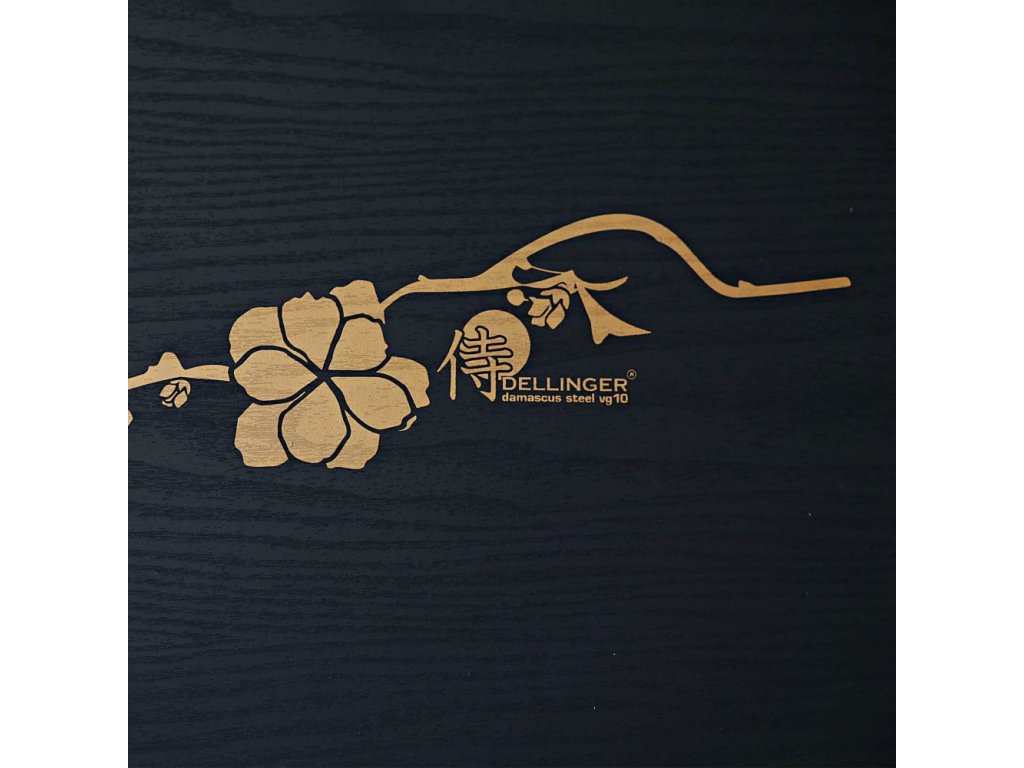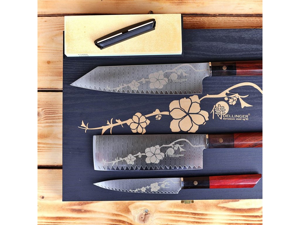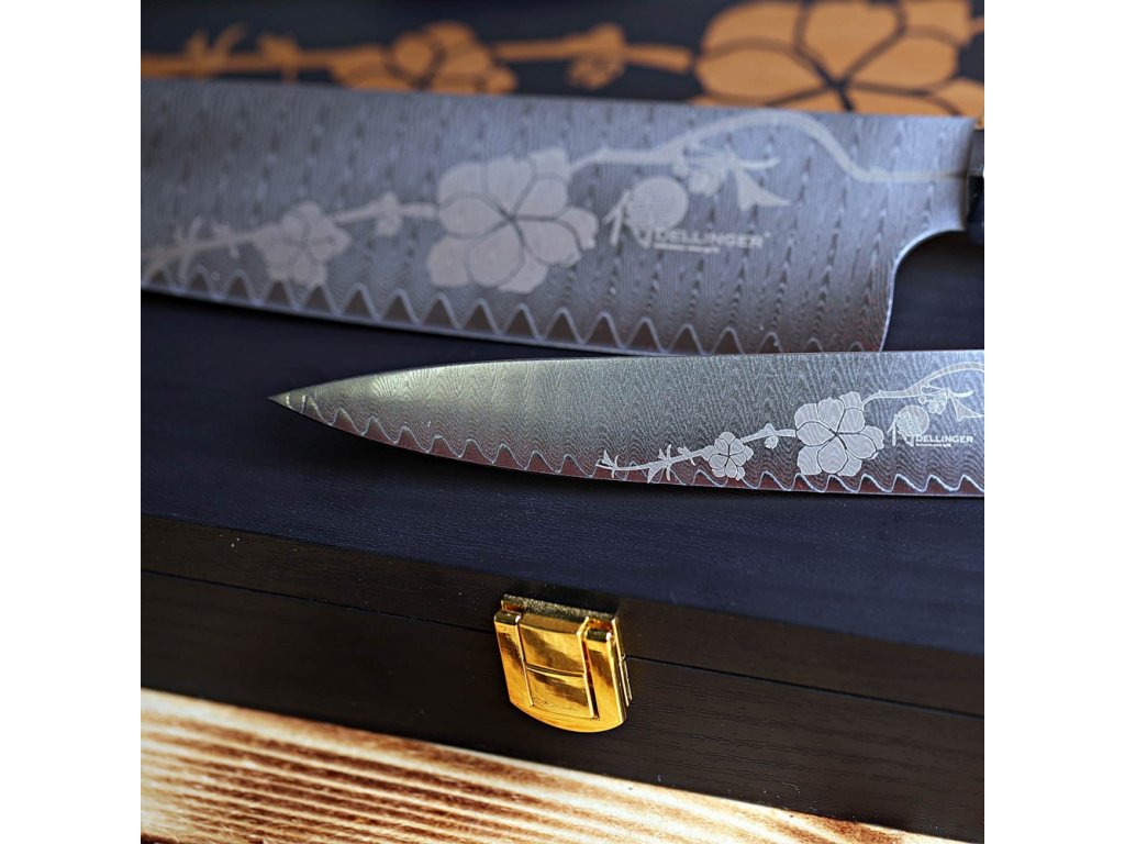 Čudovit komplet 3 nožev Dellinger JOSHI Sakura iz japonskega damaščanskega jekla VG-10 z impresivno risbo sakure na rezilu. Zelo ostro in trdo rezalno jedro iz japonskega jekla vg-10 je zelo dobro zaščiteno pred korozijo, saj je vstavljeno med 66 plasti dveh nerjavnih jekel SS316 (damaščansko jeklo), ki zagotavljata izjemno vzdržljivost in žilavost.