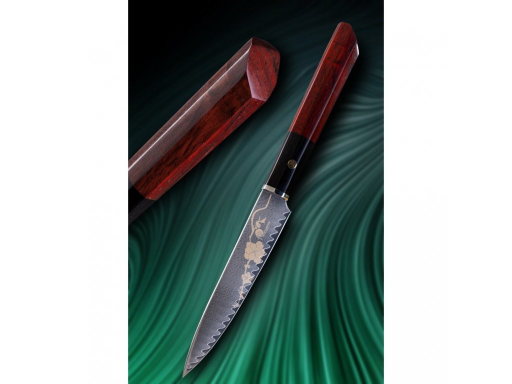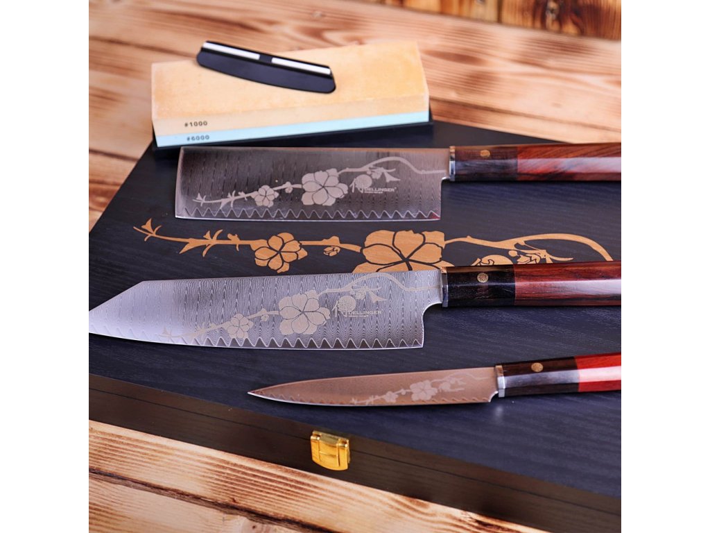 Rezila teh nožev so kaljena v visoko preciznih vakuumskih pečeh za toplotno obdelavo. Vsak nož je ročno brušen in s trdoto približno 61 HRC doseže izjemno do ekstremno ostrino. Komplet nožev iz japonskega damaščanskega jekla z impresivnim vzorcem, ki spominja na cvetove znamenite japonske češnje, je idealno darilo za vse, ki so pogosto v kuhinji in za katere je rezanje več kot le nujno zlo.