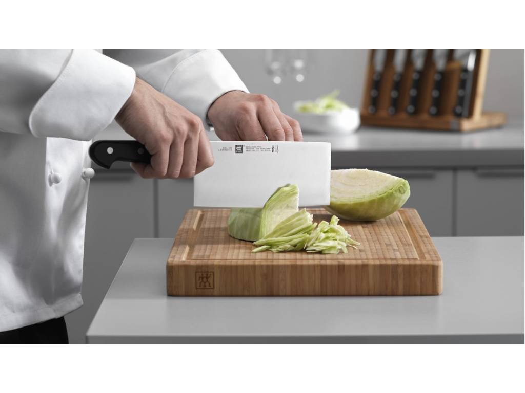 Posebni azijski komplet vključuje tradicionalni kitajski kuharski nož in rezalnik iz serije Zwilling Pro. Noži so popolnoma uravnoteženi, dobro se držijo v roki in imajo edinstveno klinasto rezilo za enostavno in varno rezanje. Serija Pro Series prinaša tudi izboljšano obliko ščitnika, ki ne le učinkovito ščiti prste, temveč tudi zagotavlja trdno oporo prstom in uravnoteži celoten nož, da je uporaba nožev udobnejša in predvsem varnejša. Stožčasta oblika omogoča tudi boljši nadzor nad rezanjem in popolno ostrenje noža. Cenili boste zdaj že tradicionalno zasnovo noža s polnim prijemalom in tremi trdnimi zakovicami.