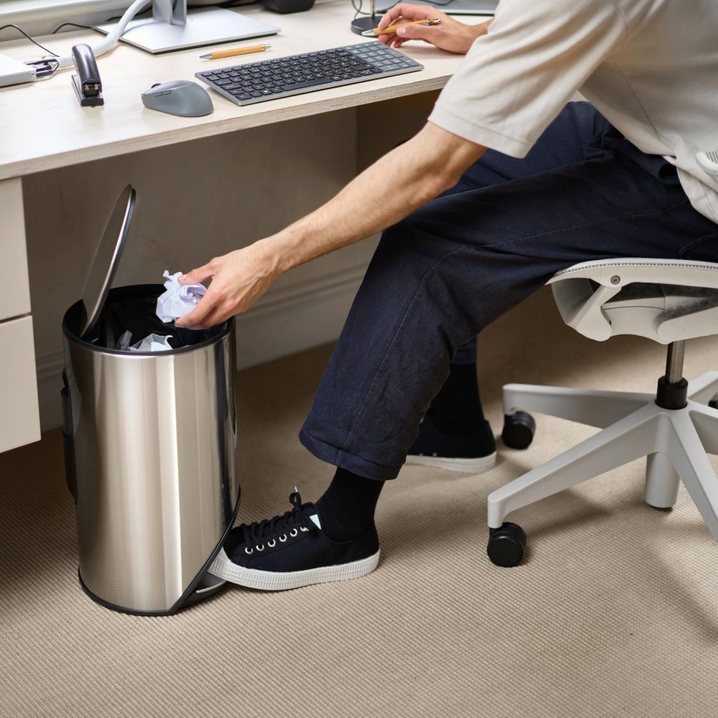 Nekateri koši poskušajo biti neopazni. Ta je tako suvereno neopazen, da ga boste opazili. Cilindrična oblika iz nerjavečega jekla z rahlo ukrivljeno linijo deluje skoraj kot dizajnerski predmet, ki se je po naključju odločil reševati vaše vsakdanje odpadke.