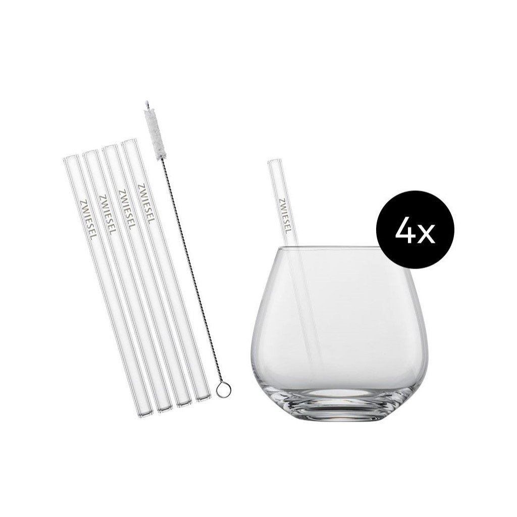 - vključuje štiri kozarce, štiri steklene slamice za večkratno uporabo z logotipom ZWIESEL in bombažno krtačko za čiščenje