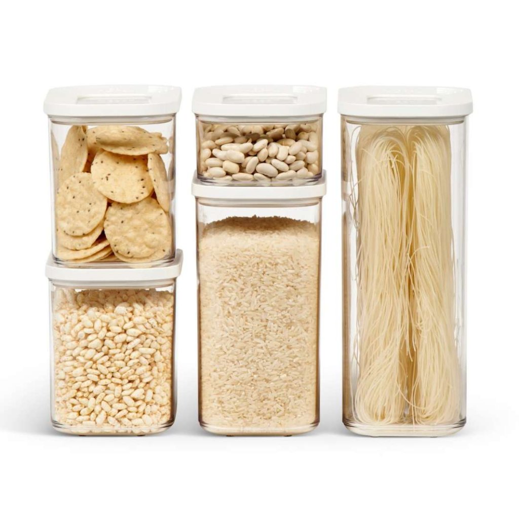 - vsebuje 2000 ml, 1500 ml, 2 × 1000 ml in 425 ml posode, zato zlahka prenese moko, kavo, testenine, čips ali riž