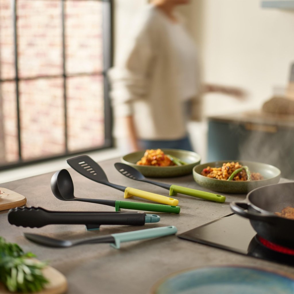 - Sodobna večbarvna zasnova ročajev daje kuhinji svež in sodoben videz, hkrati pa omogoča enostavno razlikovanje posameznih pripomočkov.