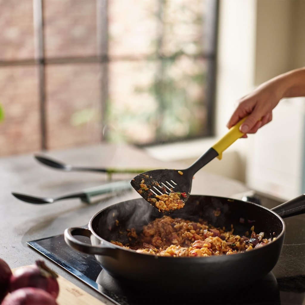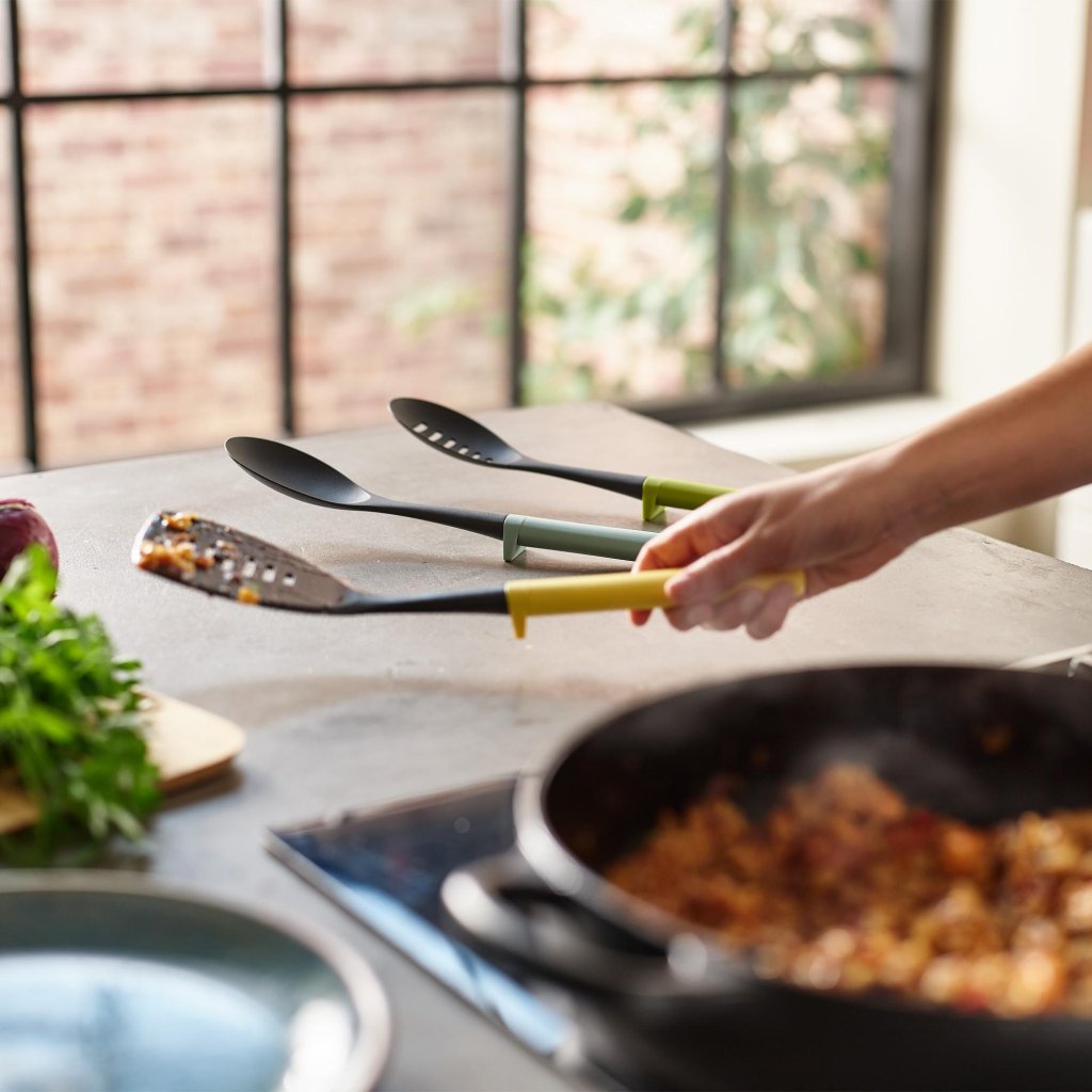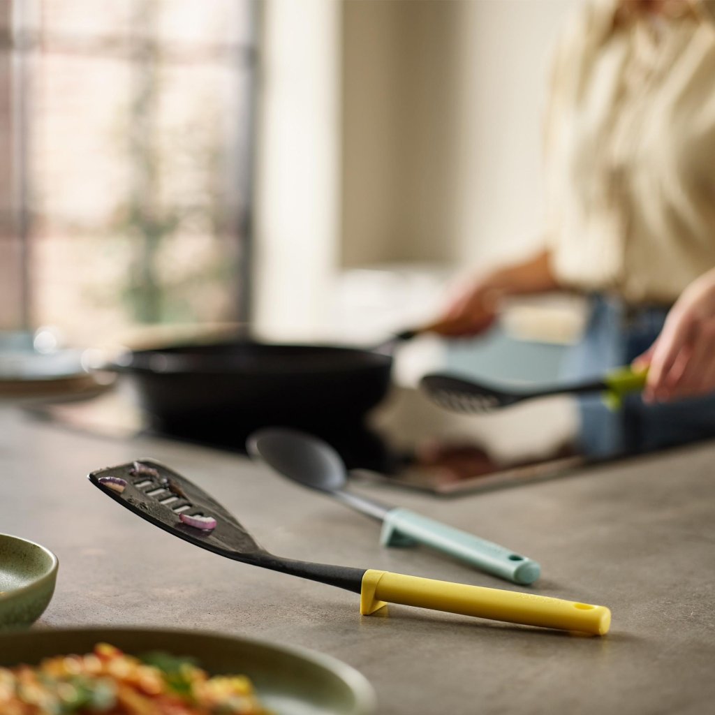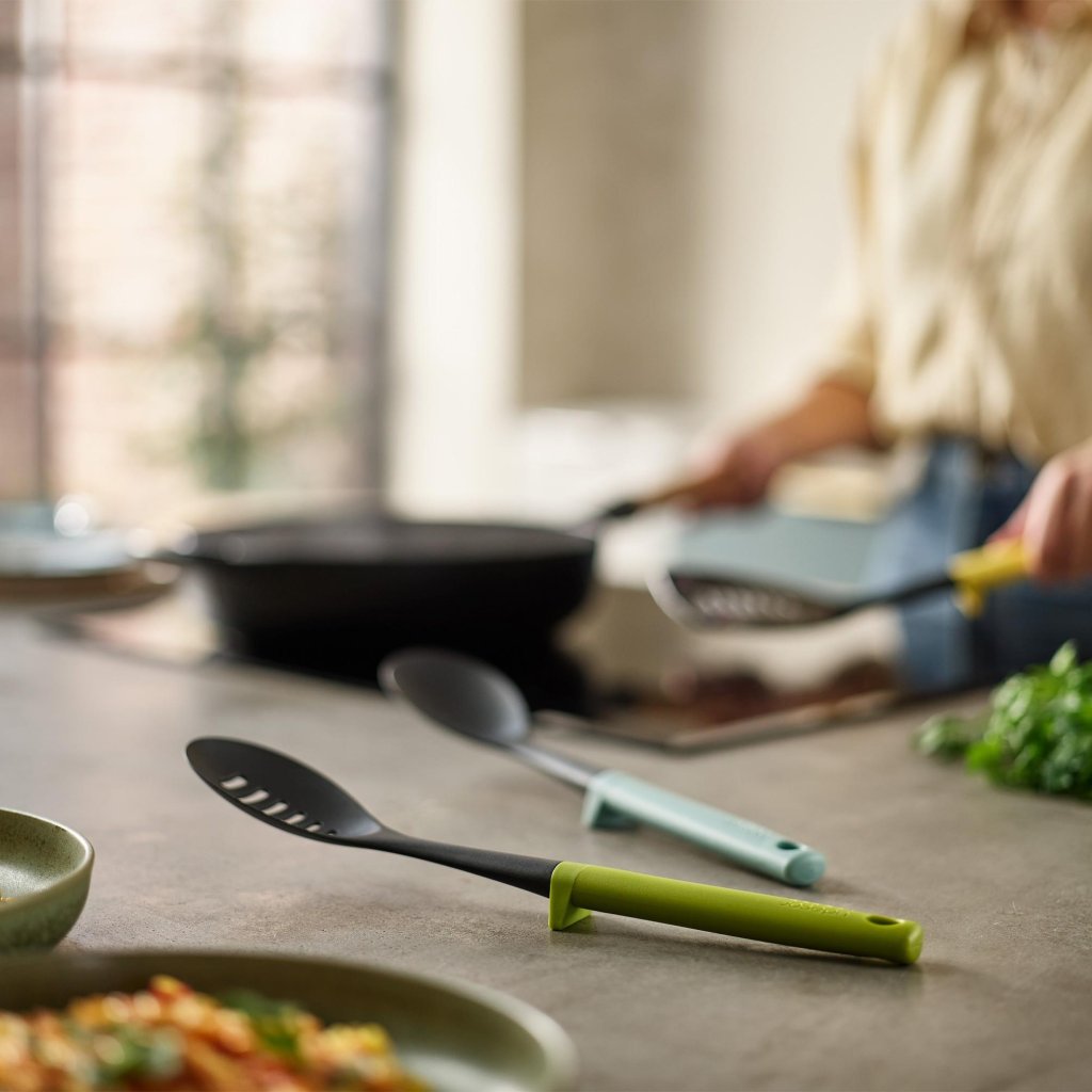 - Moderna barvna zasnova ročajev doda kuhinji svež videz in omogoča enostavno razlikovanje posameznih pripomočkov med delom.