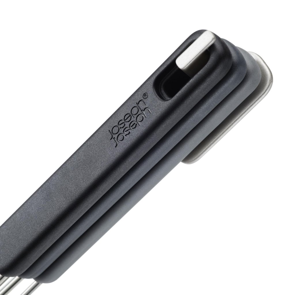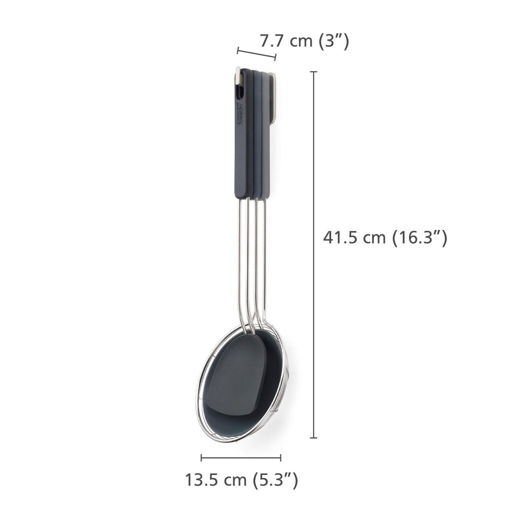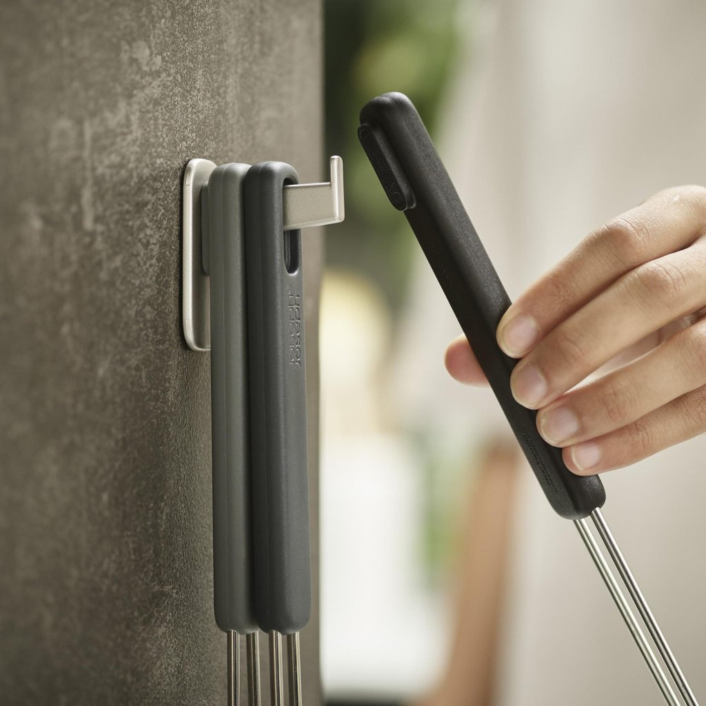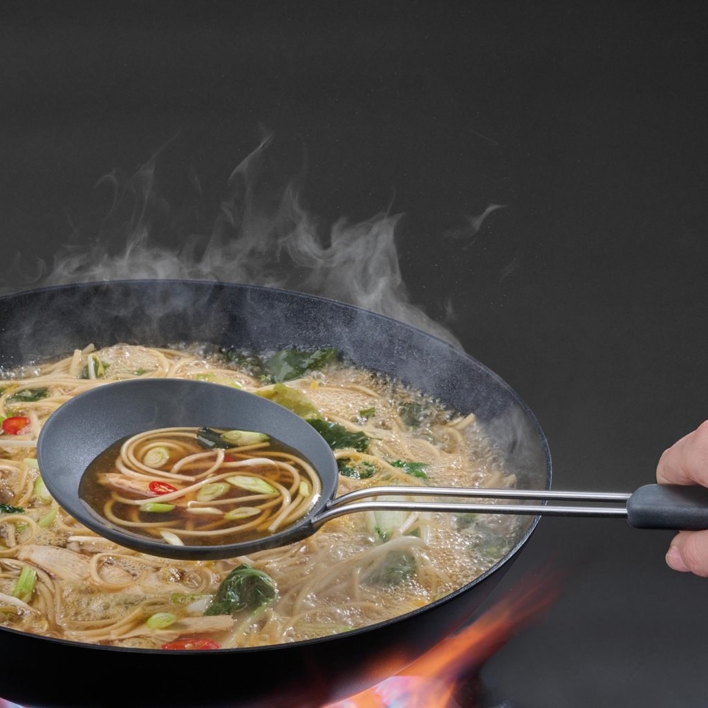 Vsaka kuhinja nima prostora za cel arzenal pripomočkov, ki bi jih cenil profesionalni kuharski mojster. Kljub temu včasih želite mešati, obračati in loviti sestavine iz ponve kot v dobri azijski restavraciji. Trije pripomočki v enem kompletu obvladajo vse bistveno in se po kuhanju zložijo tako varčno, da ne zavzamejo več prostora kot en običajen kuhinjski pomočnik.