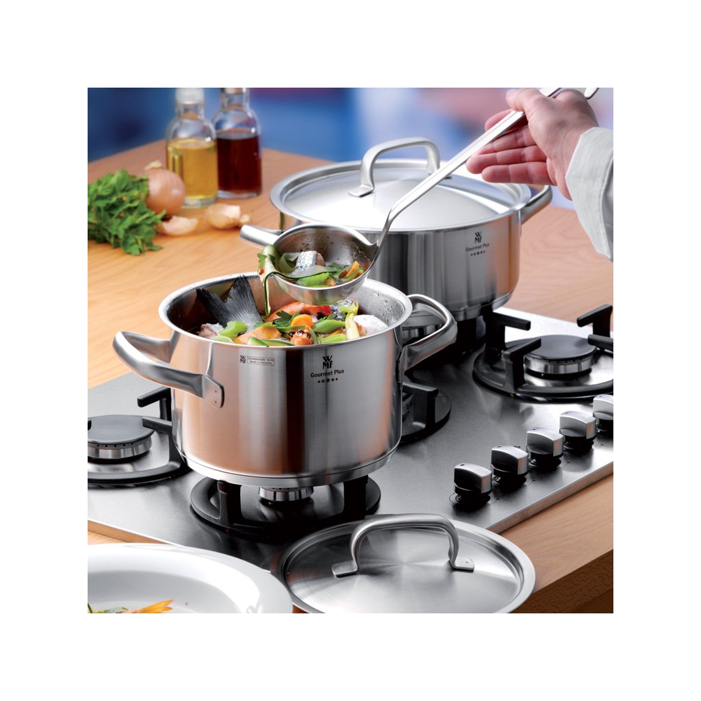 Serija Gourmet Plus nemške blagovne znamke WMF je izdelana iz nerjavečega jekla Cromargan® v čudovitem mat zaključku. K njihovi ekskluzivnosti prispeva tudi graviran logotip znamke z imenom serije na stenah loncev. Kuhinjska posoda je zelo funkcionalna in izpolnjuje vse večje zahteve kuharskih navdušencev in profesionalnih kuharjev. Veliko udobje pri uporabi zagotavljajo veliki ročaji, ki so prav tako hermetično zaprti in se ne zažgejo.