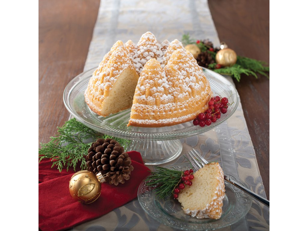 Srebrna posoda za pecivo Pine Forest Bundt® z motivom drevesa iz kolekcije Holiday ameriške blagovne znamke Nordic Ware je izdelana iz visokokakovostnega masivnega litega aluminija s prevleko proti sprijemanju. Torta iz tega srednje velikega modela bo lepo okrasila praznično pogrnjeno mizo ne le ob božiču, temveč tudi ob številnih drugih posebnih priložnostih.