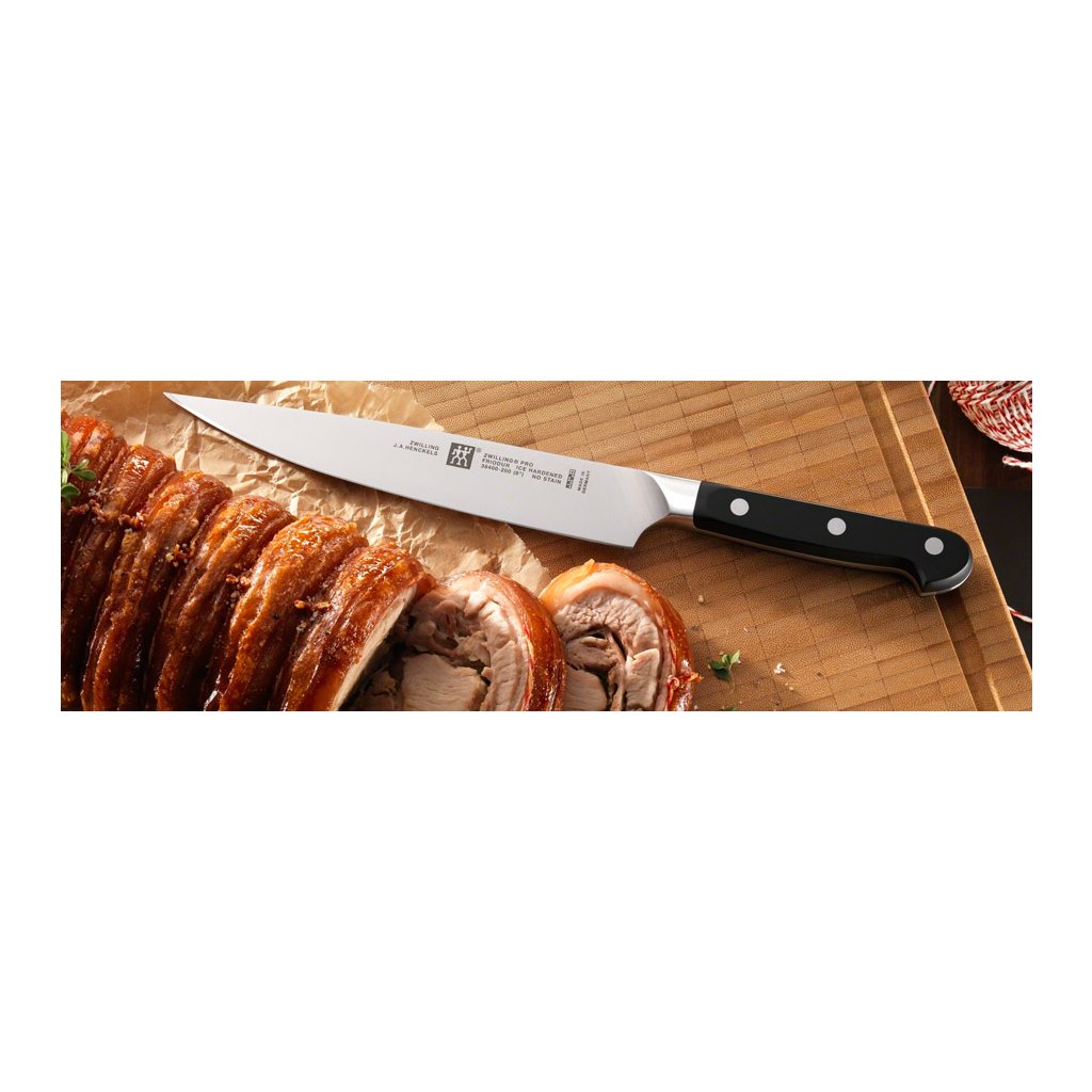 ZWILLING® Pro je tanek nož z vzdržljivim, 20 cm dolgim rezilom in finim robom. Primeren je za pripravo vseh vrst mesa in za rezanje pečenk.
