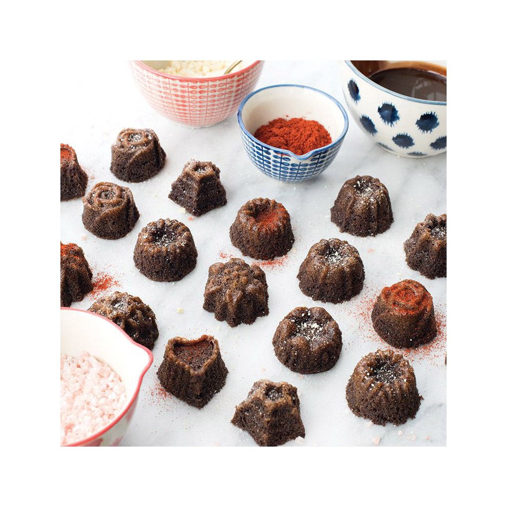 Kalup je najprimernejši za vlivanje čokolade, približno 600 g čokolade zadostuje za izdelavo 30 čudovitih pralin. V njem lahko pripravite tudi različne vrste nepečenih slaščic, na primer iz marcipana, kalupe pa lahko napolnite tudi s pudingom ali želejem. Posamezni kalupi z lepo izdelanimi podrobnostmi so v obliki miniaturnih tort, ki jih lahko spečete v kalupih Nordic Ware v veliki različici.