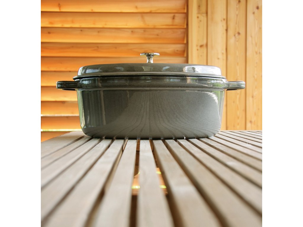 Emajlirana notranja površina je mat črne barve in zagotavlja, da bo vse, kar v njej pripravite, okusno in nežno. Zaprta cirkulacija in majhne izbokline na spodnji strani pokrova ustvarjajo idealne pogoje za počasno kuhanje in dušenje.