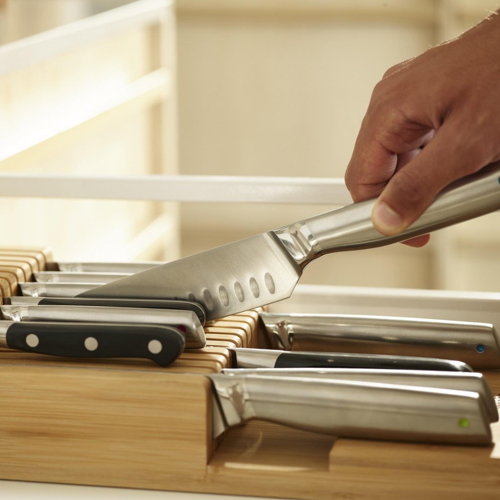 - Shranjevanje nožev v predalu pomaga ohranjati čistočo kuhinjskega pulta in ustvarja več prostora.
