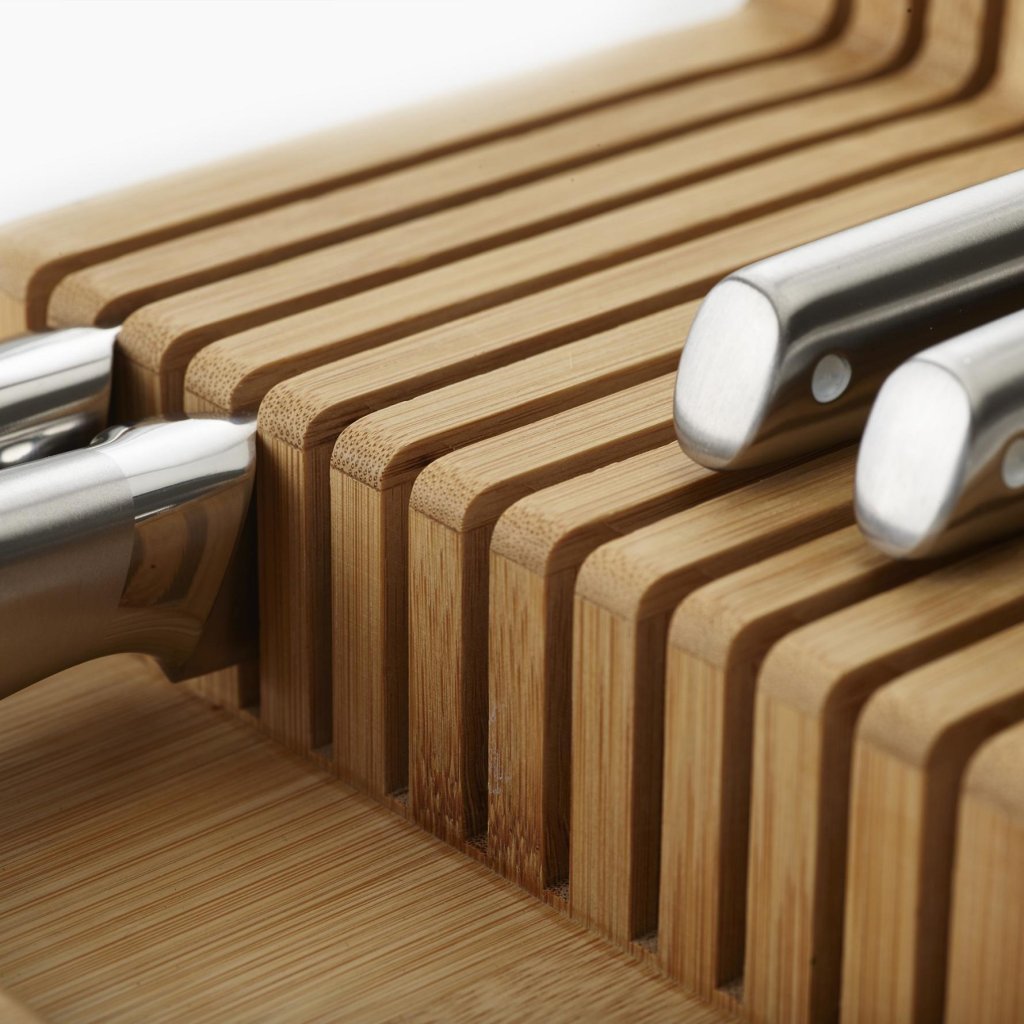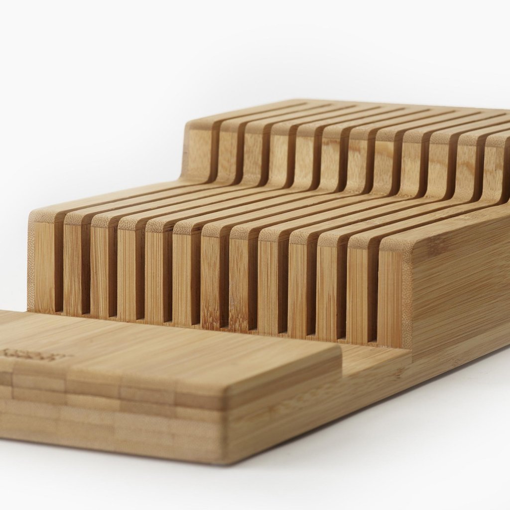 - Organizator za nože Joseph Joseph DRAWERSTORE iz bambusa vam omogoča varno in urejeno shranjevanje kuhinjskih nožev neposredno v predalu.