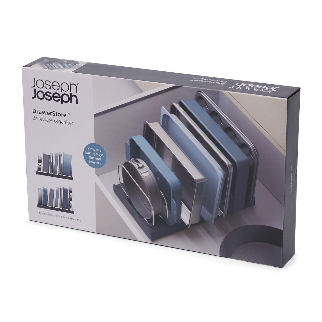 - Organizator za pekače Joseph Joseph DRAWERSTORE pomaga pregledno urediti pekače, pekače in modele za torte v kuhinjskem predalu.