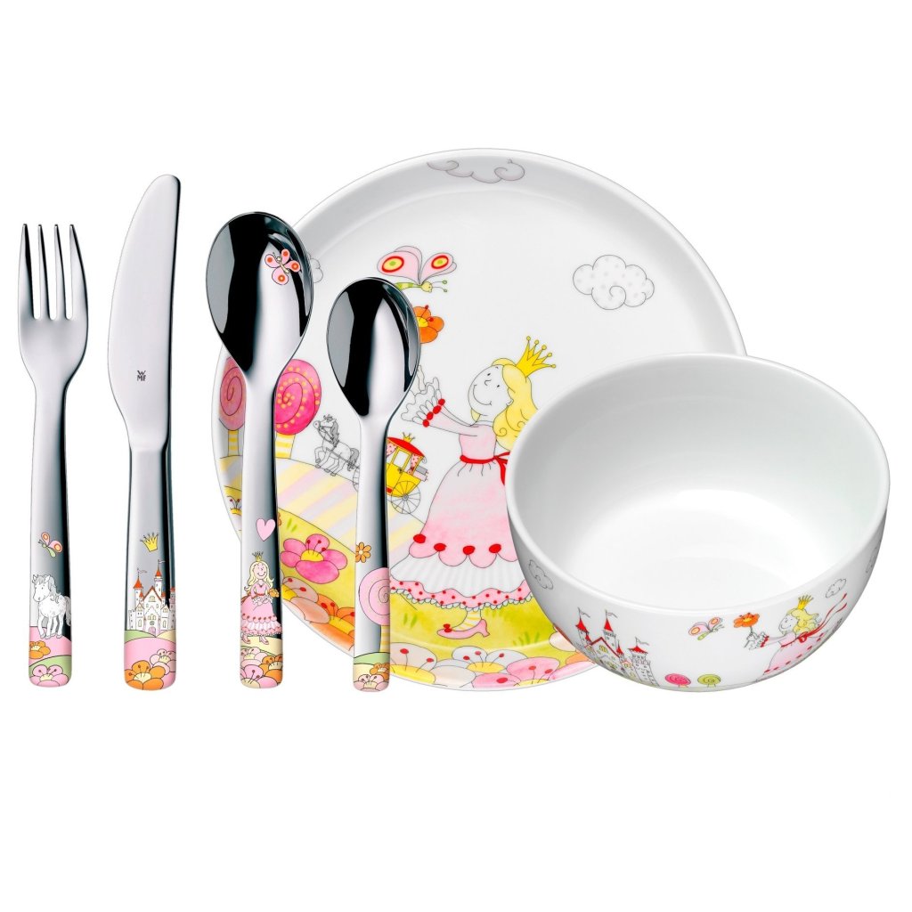 - vsebuje šest kosov: štiridelni pribor, porcelanast krožnik in skledo, vse s pisanimi motivi princesk in pravljičnega kraljestva