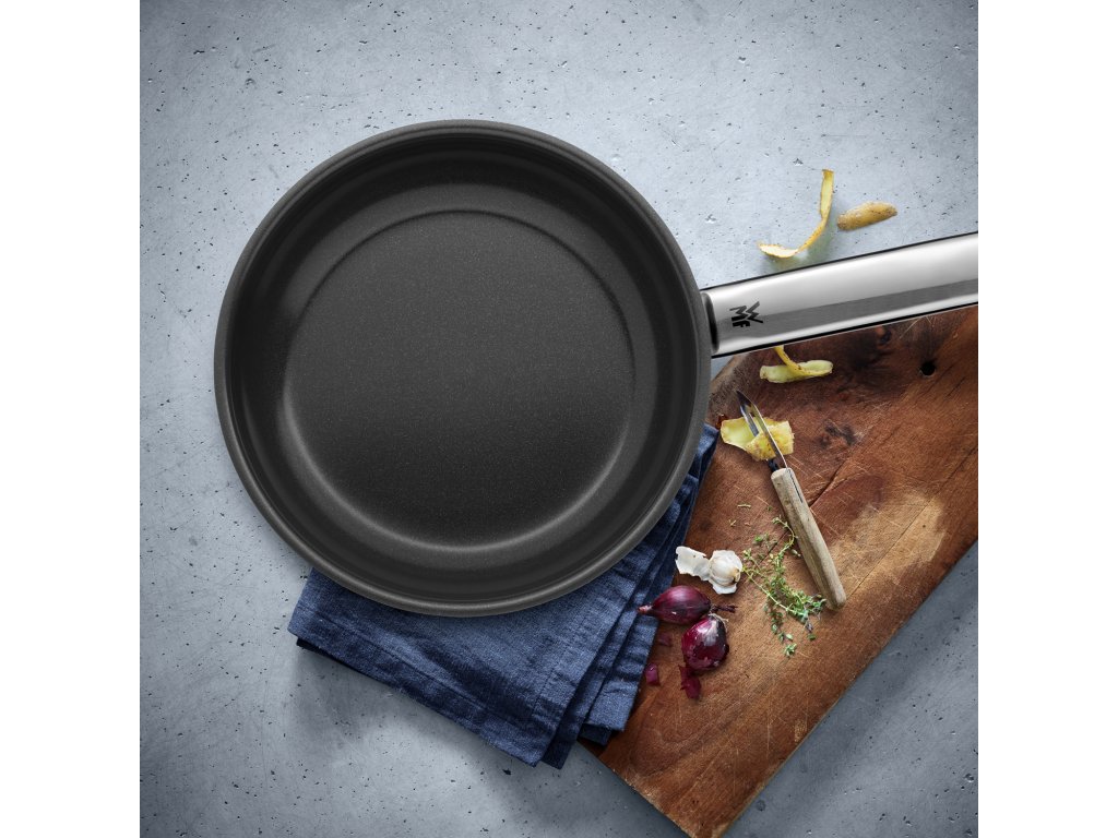 Z veseljem boste pripravljali različne pečene ali ocvrte dobrote v klasično oblikovani ponvi iz nerjavečega jekla z nelepljivo površino CeraDur® nemškega proizvajalca WMF. Klasična okrogla oblika z višjim robom je zelo praktična za pripravo različnih omlet, mesnih in zelenjavnih mešanic, rižot, testenin s kremastimi omakami ali na primer jedi iz morskih sadežev. Kombinacija najkakovostnejših materialov vam zagotavlja najboljši rezultat vsakič, ko pečete, cvrete ali sotirate. Širok rob omogoča, da vsebino posode udobno izlijete brez razlitja.