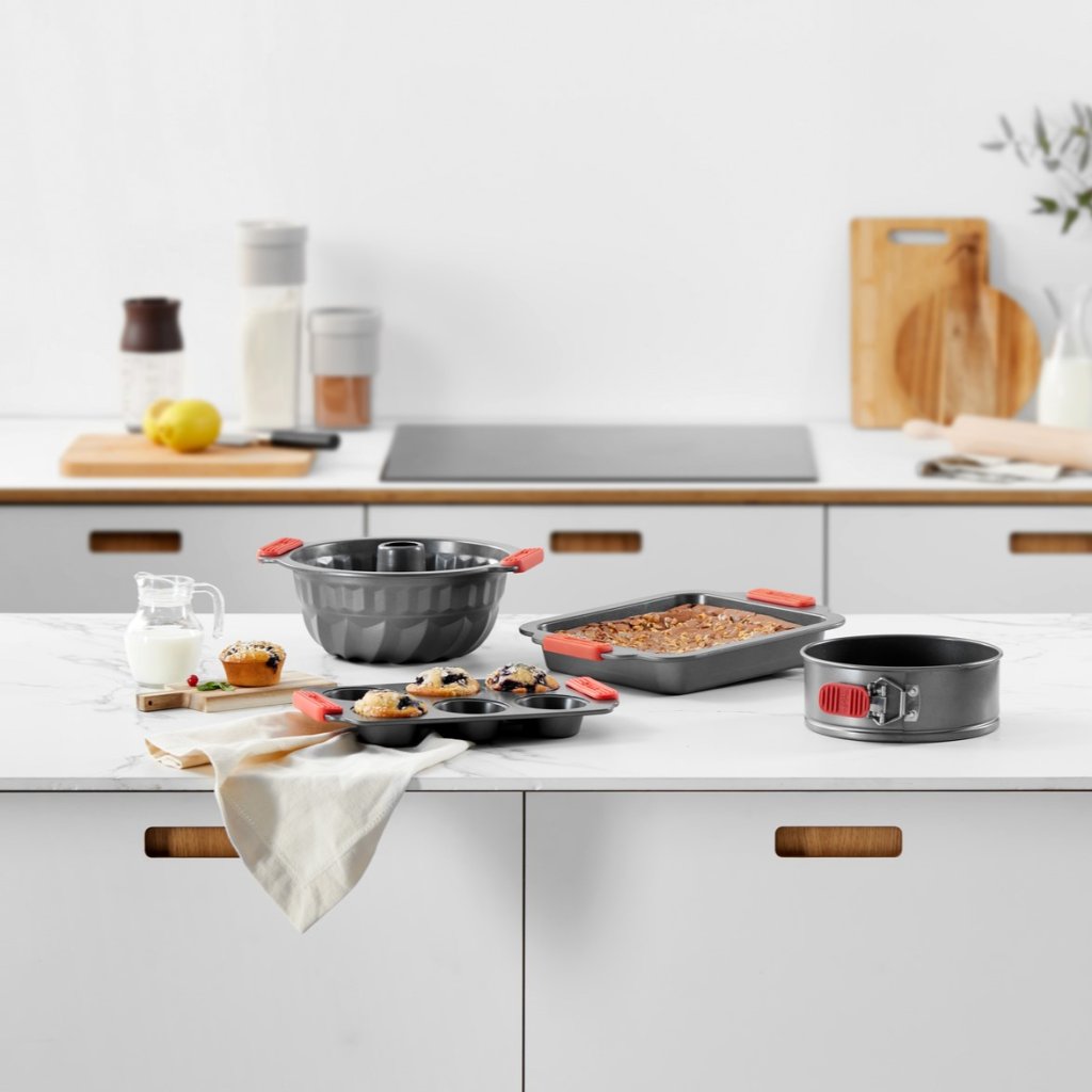 - matirana siva površina kalupa je v kontrastu z rdečimi silikonskimi ročaji, ki povečajo njegovo privlačnost
