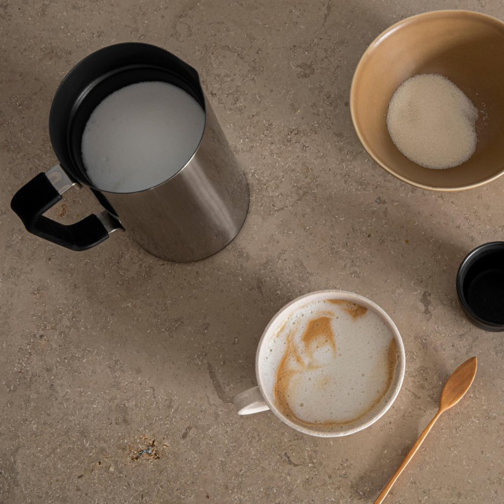 - Ergonomski ročaj z nedrsečo površino zagotavlja udobno rokovanje in stabilnost med vlivanjem pene v skodelico.