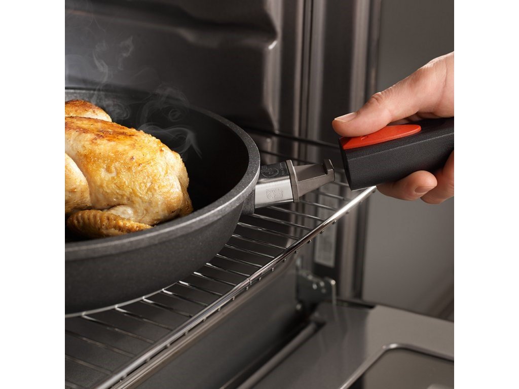 - Varčuje s prostorom za shranjevanje, lahko se uporablja za peko v pečici (brez odstranljivega ročaja)