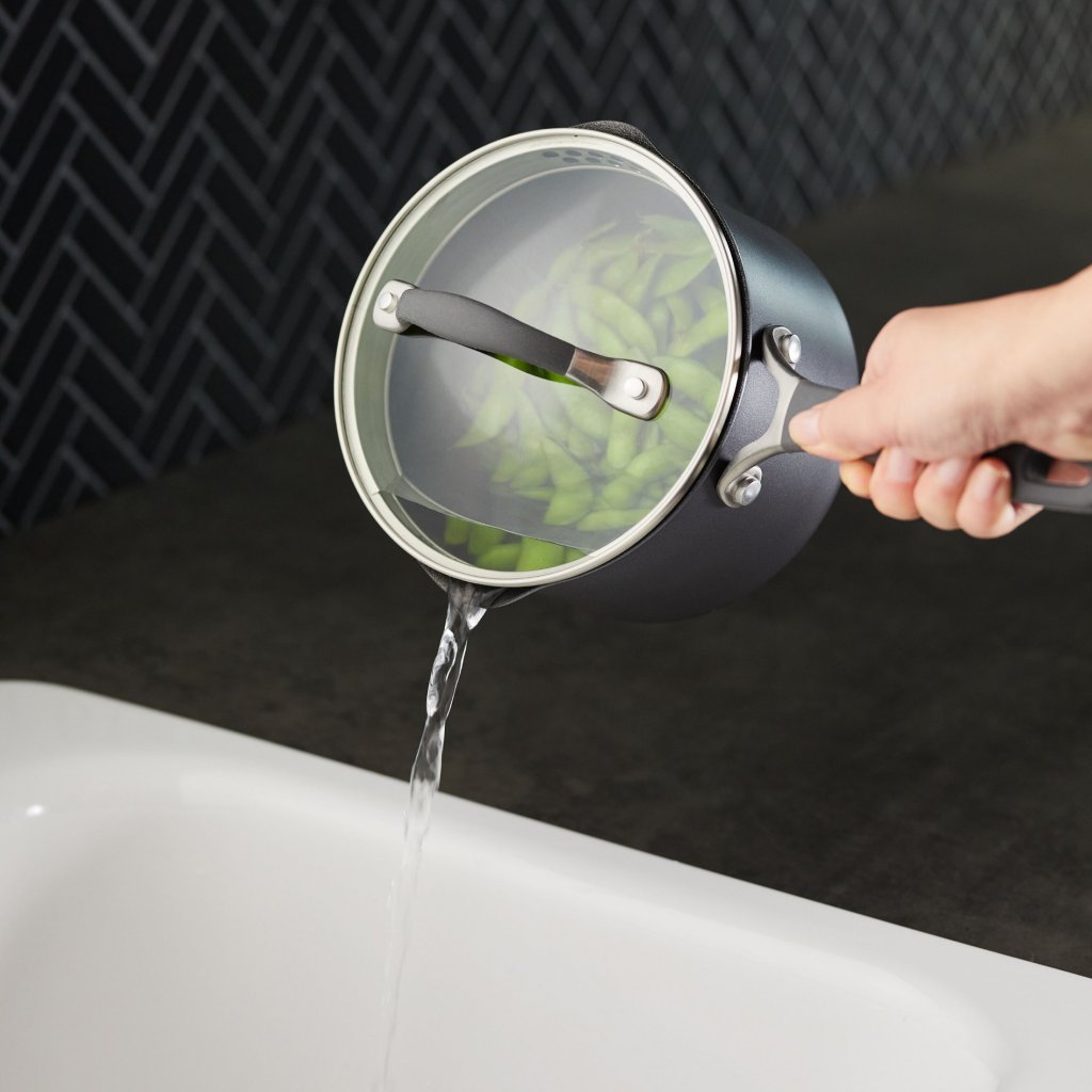 - Natančno prilegajoče nerjaveče jeklo pokrov za lonec je opremljeno z luknjami za enostavno filtriranje vode.