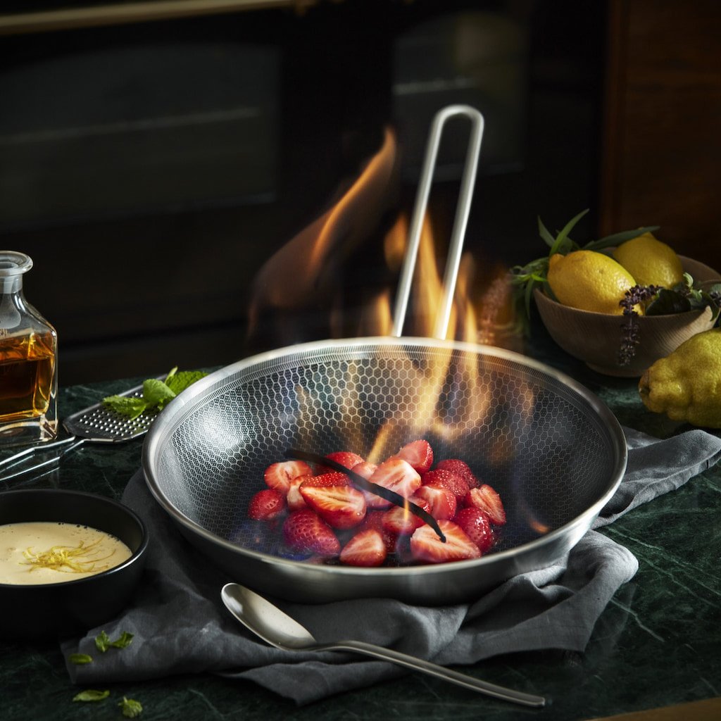 - zaradi elegantnega dolgega ročaja je ponev videti lahka in profesionalna, primerna za odprte kuhinje