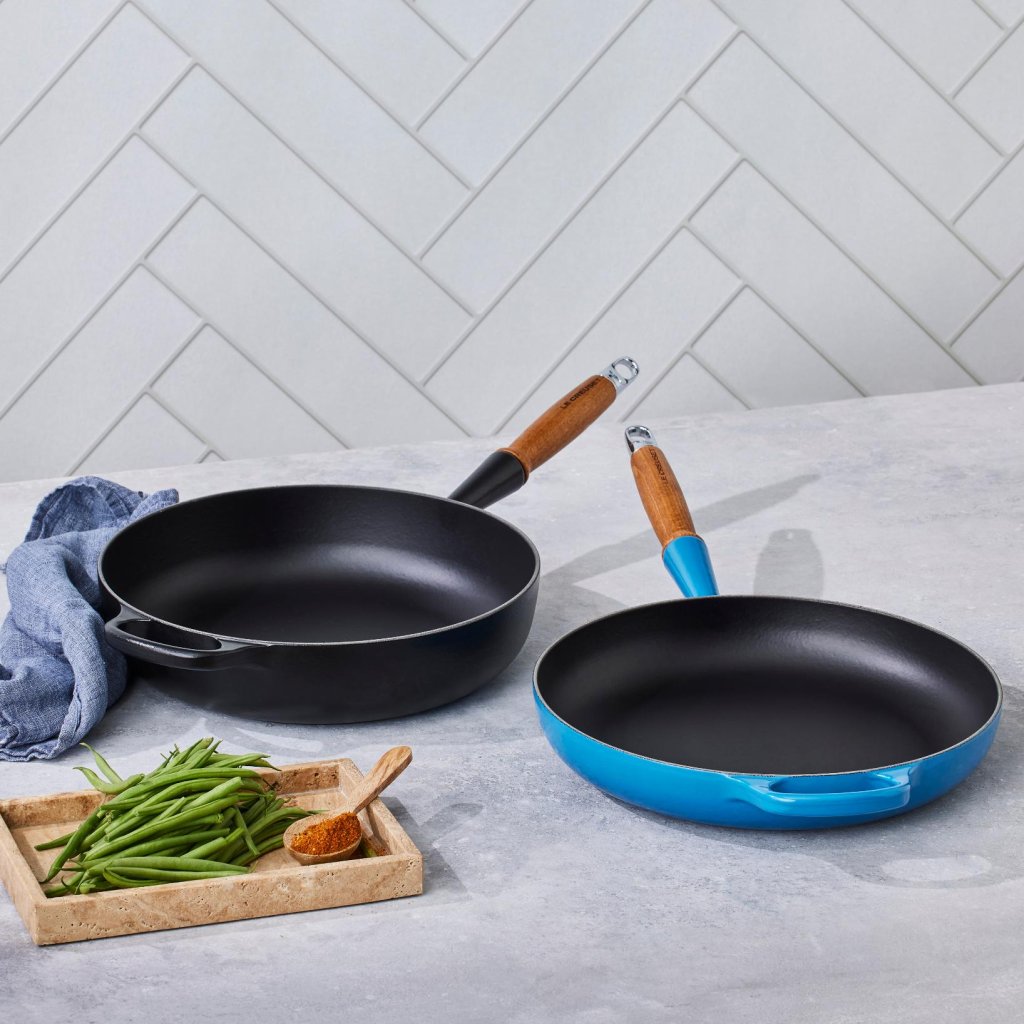 - Litoželezna ponev Le Creuset v barvi AZURE z lesenim ročajem je odlična izbira za vsakodnevno kuhanje, od praženja mesa do sotiranja zelenjave.