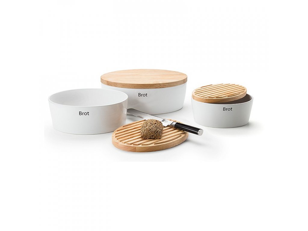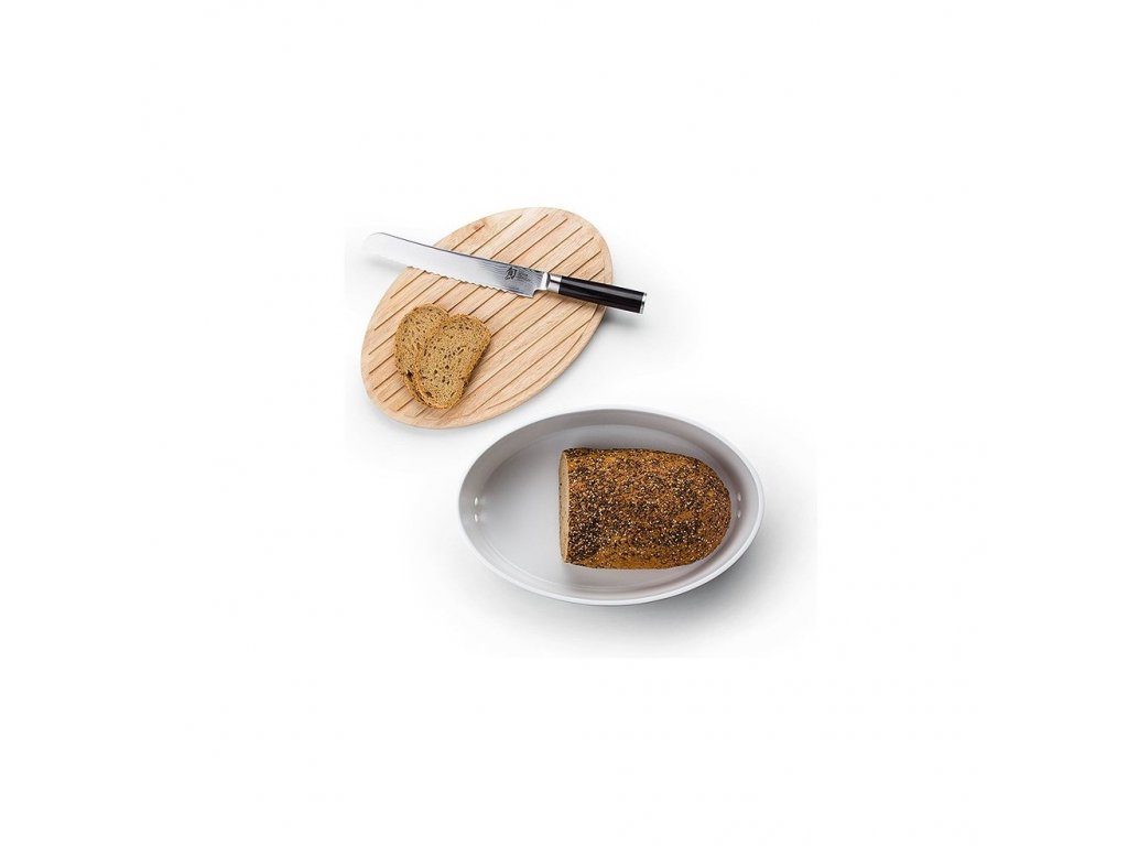 Keramična posoda za kruh s pokrovom iz gumijastega lesa, ki služi tudi kot obojestranska deska za rezanje. Na eni strani je ravna, na drugi pa nazobčana. Posoda za kruh ima prezračevalne odprtine. Keramika je glazirana in primerna za pomivanje v pomivalnem stroju. Lesenega pokrova ni mogoče pomivati v pomivalnem stroju.