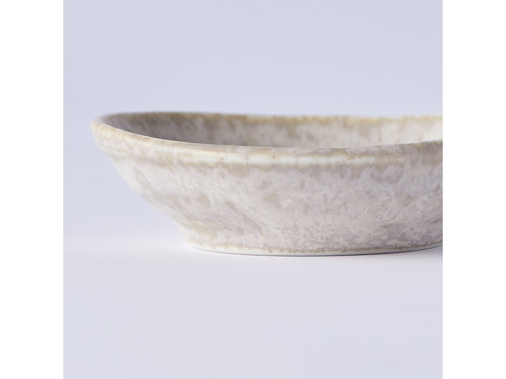 Ima mat peščeno barvo z nežnimi rjavimi okraski in spominja na čisto morsko plažo. Rob posode je nepravilen in drobno obrobljen z rjavo barvo.