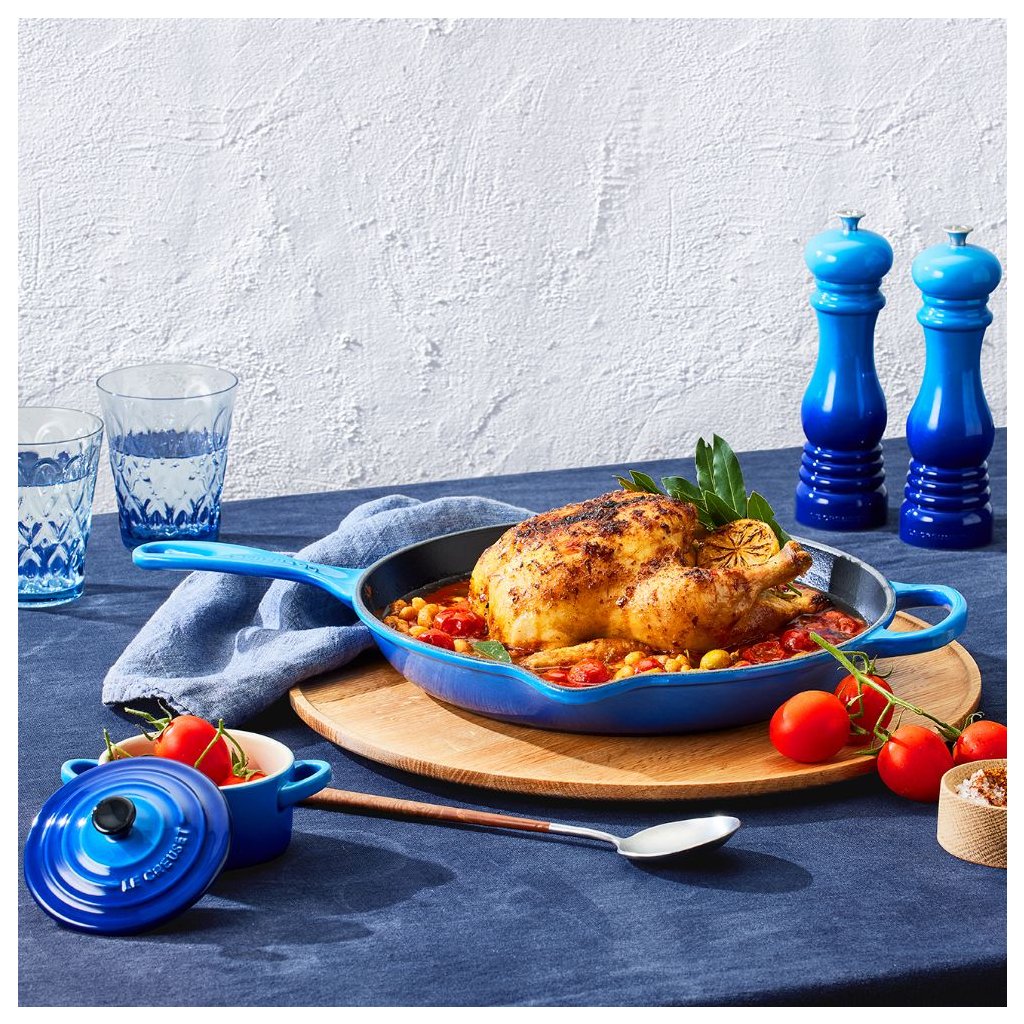 - Barva AZURE – sveža, svetla in poživljajoča – v notranjost vnaša harmonijo in pridih francoske elegance, ki se poda tako v moderne kot klasične kuhinje in se odlično ujema z drugimi jedmi Le Creuset v istem odtenku.