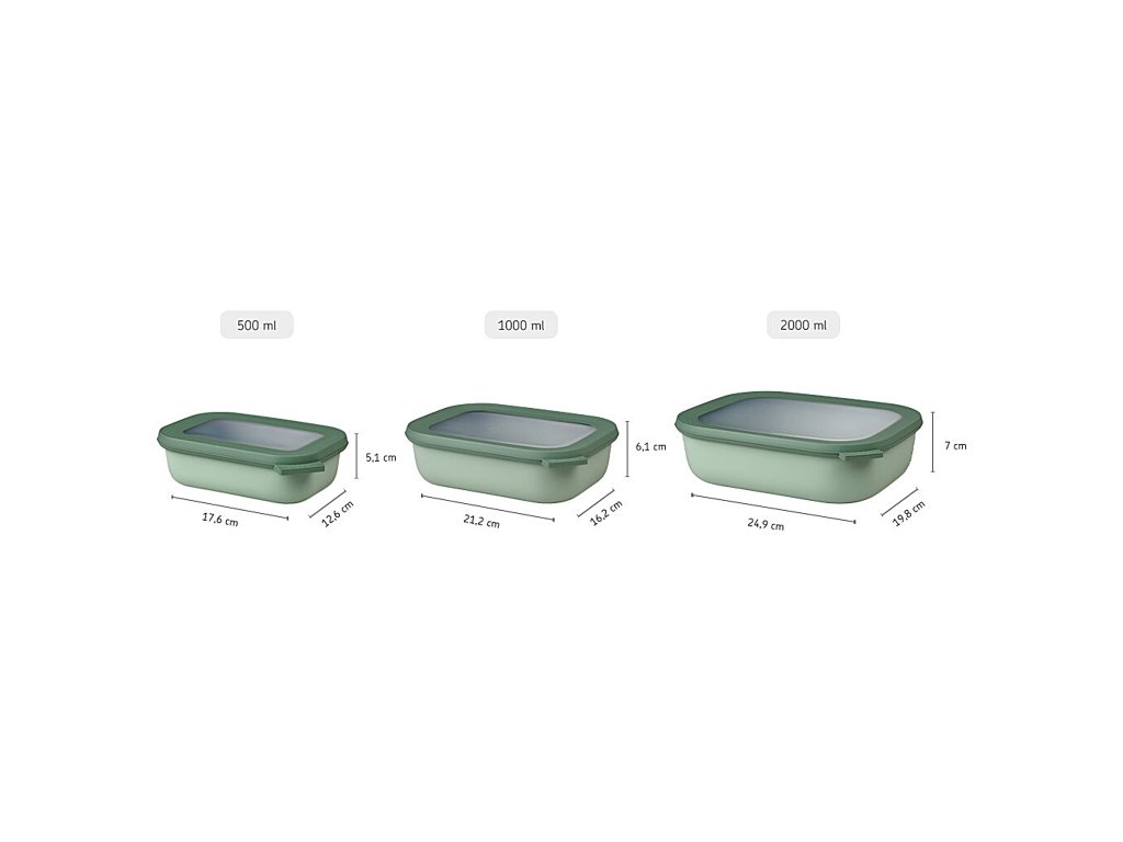 - praktične velikosti 500 ml, 1000 ml in 2000 ml omogočajo shranjevanje testenin, solat, peciva ali obrokov glavnih jedi