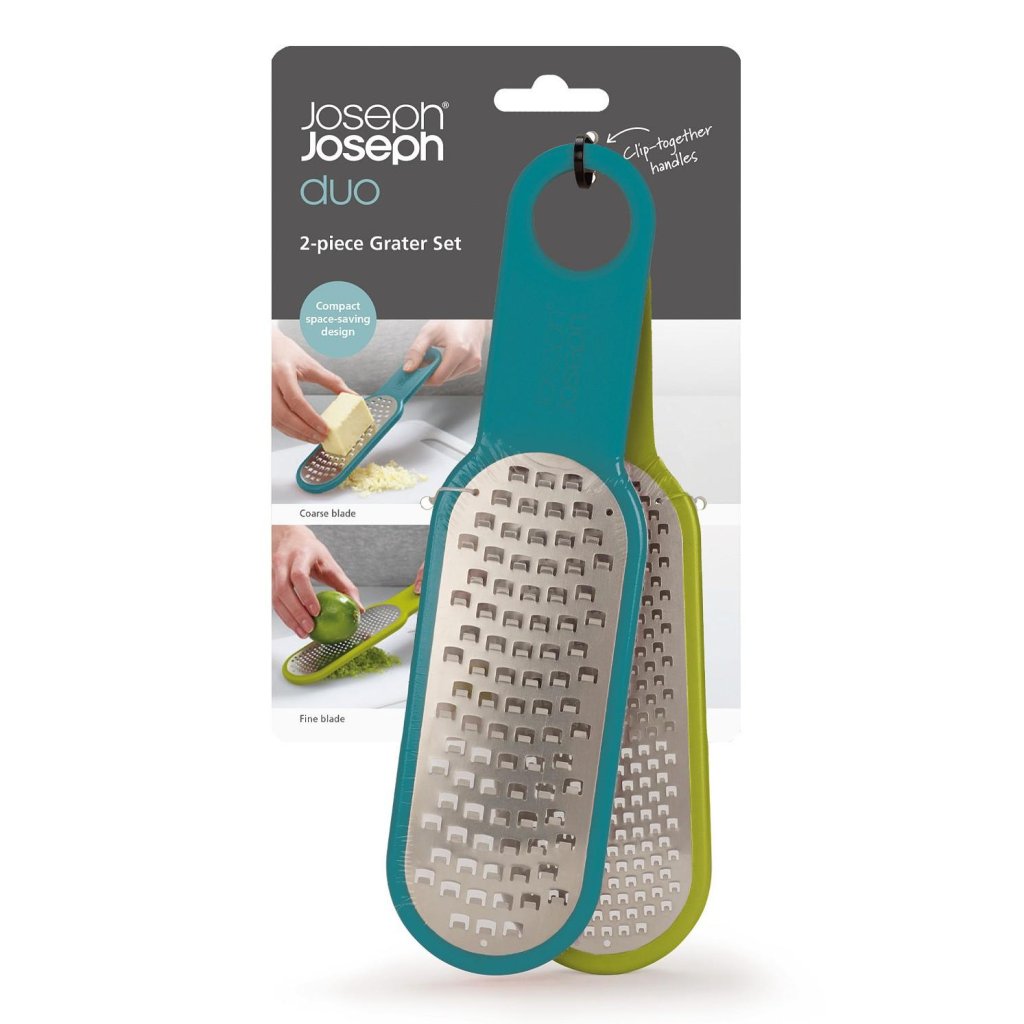 - Set dveh strgalnikov Joseph Joseph DUO prinaša praktično rešitev za hitro in udobno ribanje sirov, zelenjave in citrusove lupine pri vsakodnevnem kuhanju.