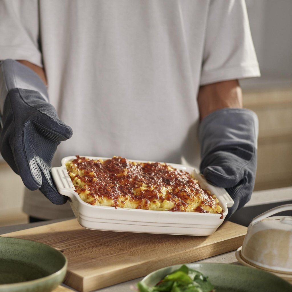 - Zahvaljujoč natančnemu oblikovanju lahko vroče pekače, modele za torte in litoželezne lonce udobno in samozavestno prenesete neposredno iz pečice na mizo.