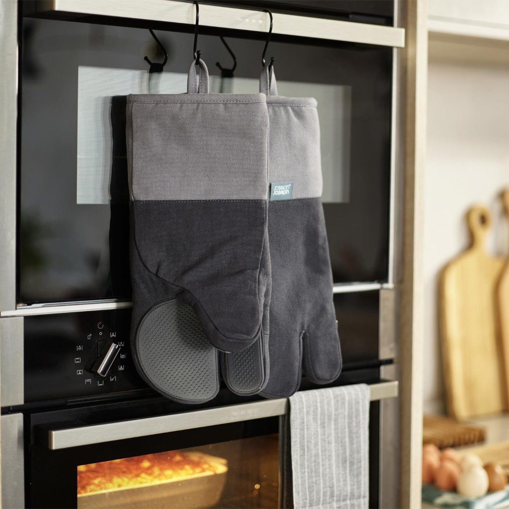 - Elegantna kombinacija svetlo in temno sivega tekstila s silikonskimi elementi izgleda moderno in se bo zlahka prilegala v vsako elegantno kuhinjo.