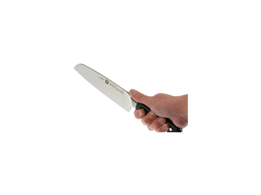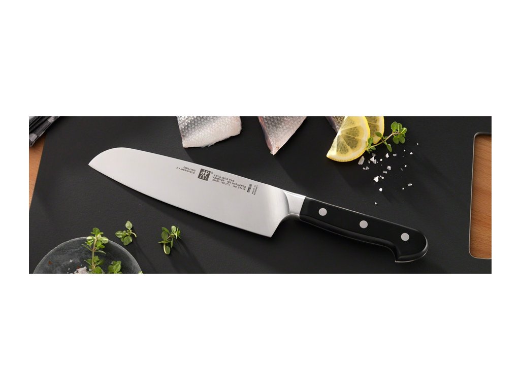 Santoku ZWILLING® Pro je eden od azijskih nožev. Ponaša se s širokim in predvsem ostrim rezilom. Vsi noži Santoku proizvajalca ZWILLING J. A. Henckels ima natančno polirano rezilo. Bolj polirana stranica zmanjšuje trenje, zato je rezanje natančnejše in zahteva manj truda. Ta vsestranski pripomoček iz azijske kuhinje lahko uporabite na tri načine: za pripravo mesa, rib in zelenjave. Odlično rezilo noža Santoku boste cenili na primer pri rezanju paradižnika, katerega oblika in tekstura se med rezanjem ne spremenita.
