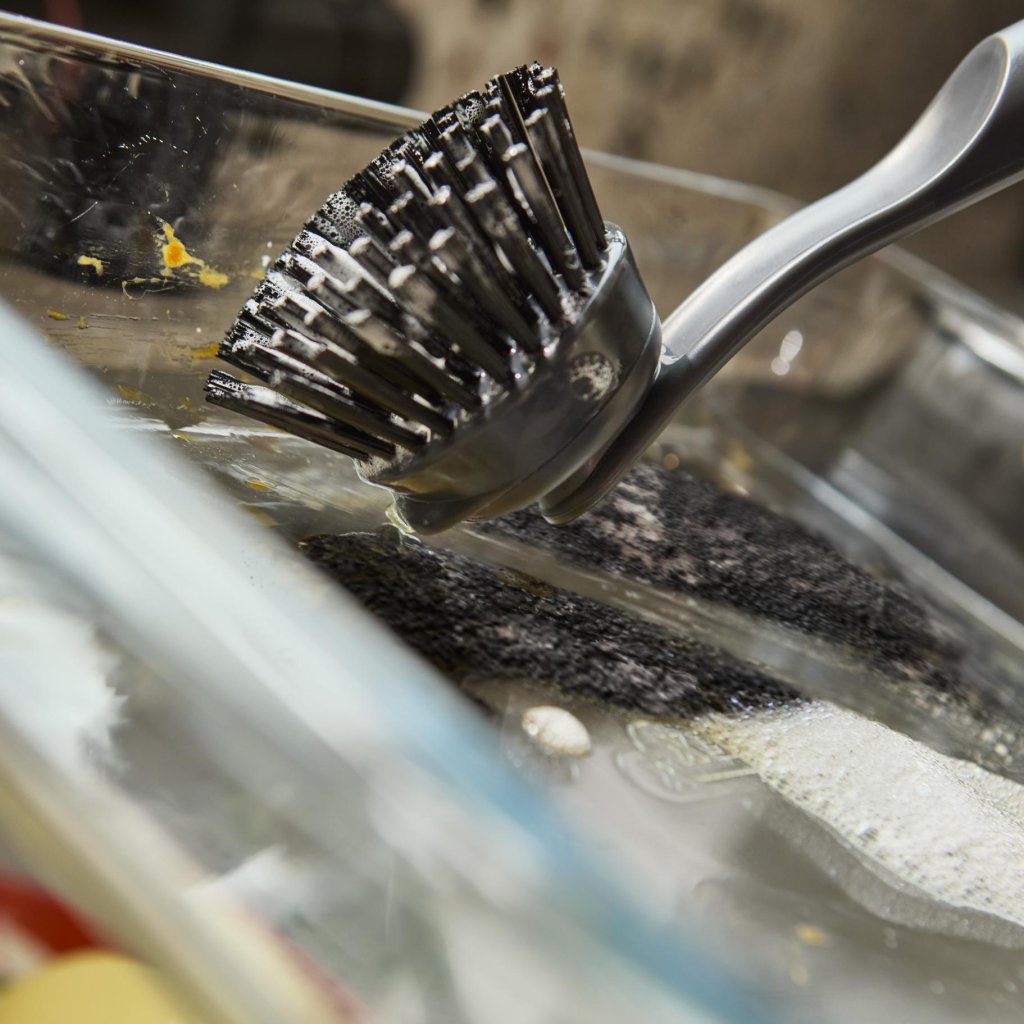 Le eno pravo orodje in korito ne bo več videti kot kraj zadnjega upora. Ta krtača ima zamenljivo glavo, tako da, ko bodo ščetine opravile svoje, jo boste preprosto zamenjali z novo. Manj odpadkov, manj izgovorov, več čistih krožnikov.